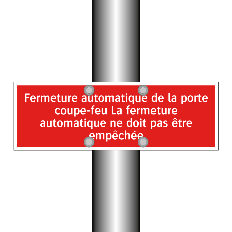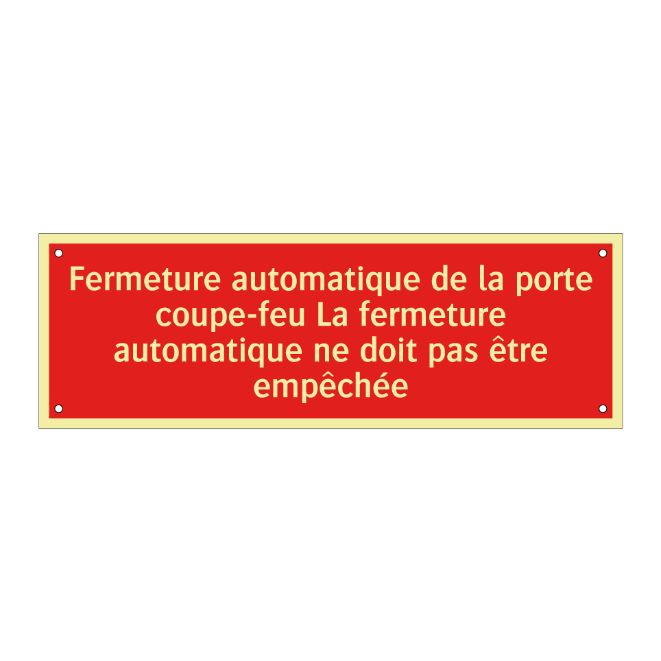 Cette signalisation de sécurité incendie est essentielle pour garantir la sécurité dans les bâtiments publics et privés. Elle indique clairement que la porte coupe-feu doit se fermer automatiquement et ne doit pas être obstruée. Idéale pour les couloirs, les entrées de bâtiments ou les zones de passage, elle assure que les mesures de sécurité incendie sont respectées. Avec son fond rouge et son texte blanc, elle est facilement visible et attire l'attention, garantissant ainsi une réaction rapide en cas d'urgence.