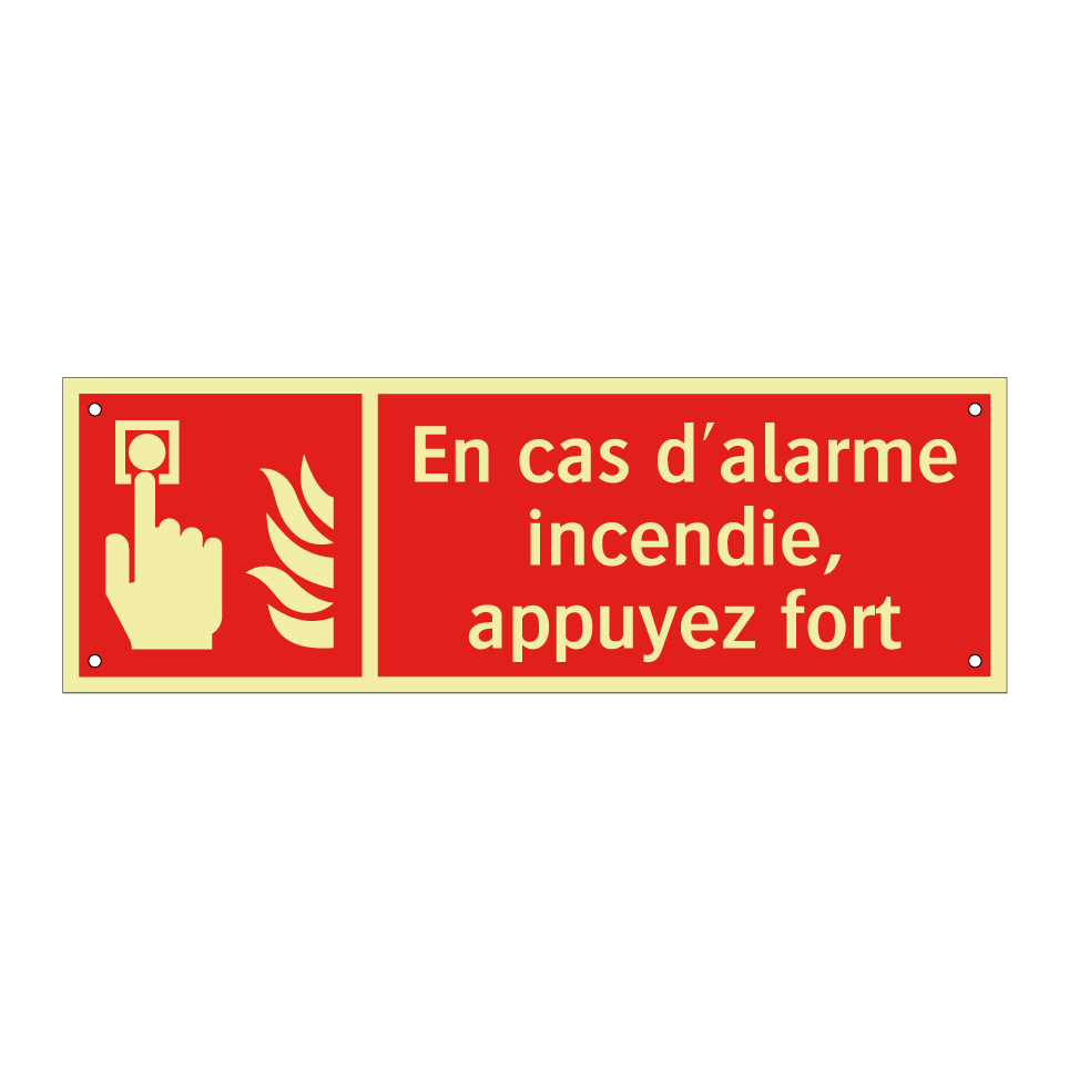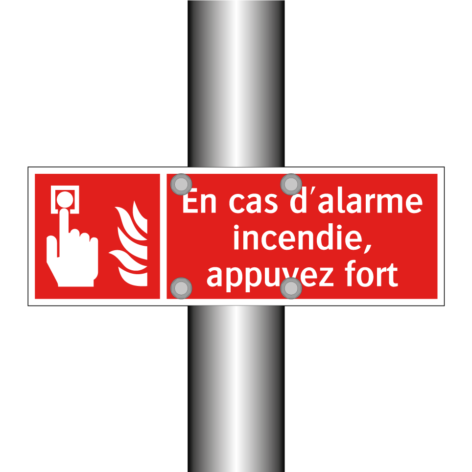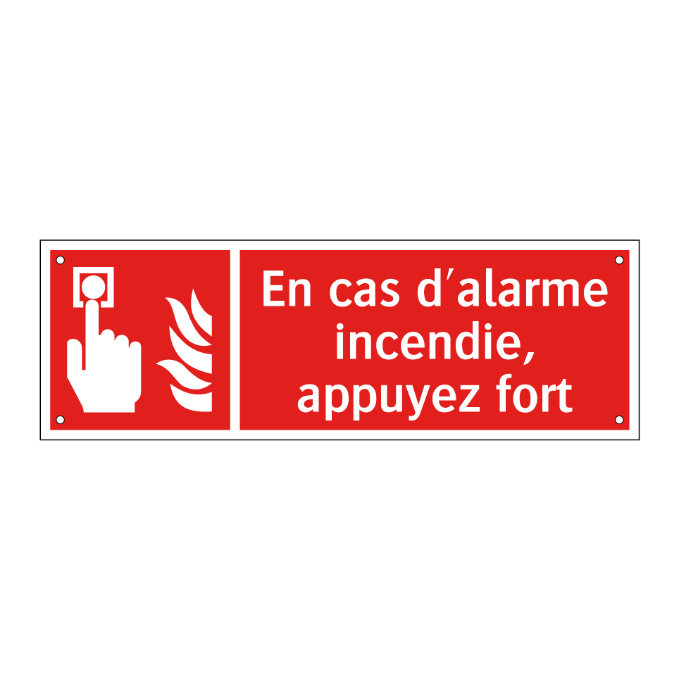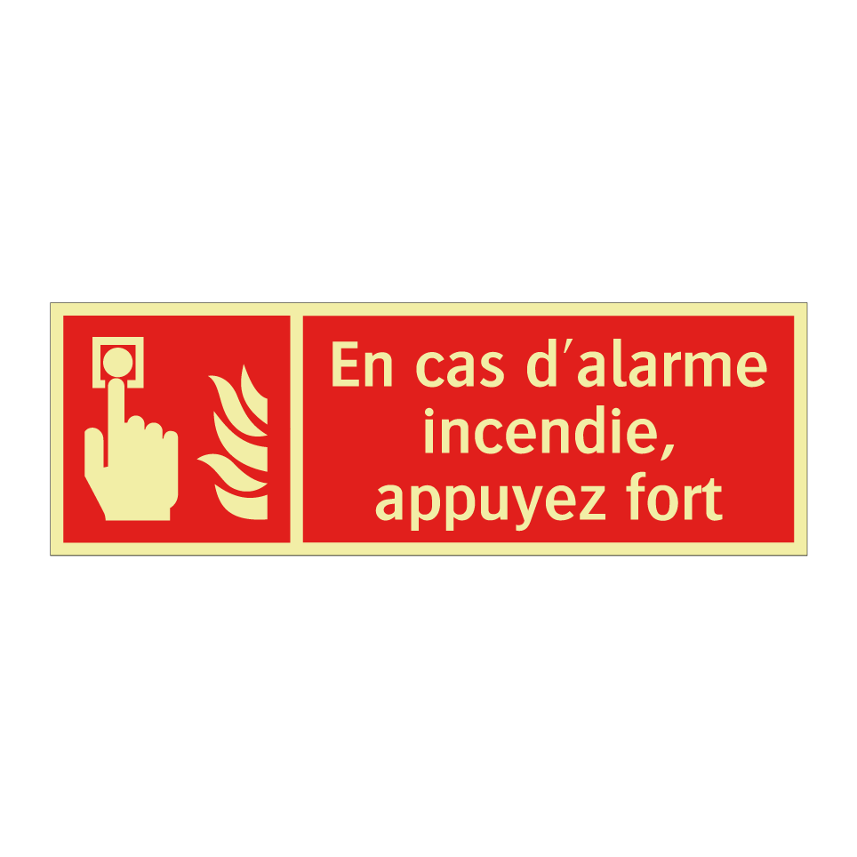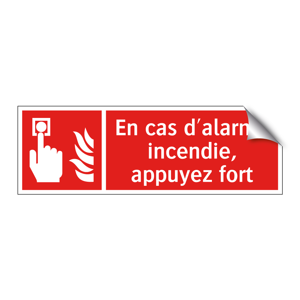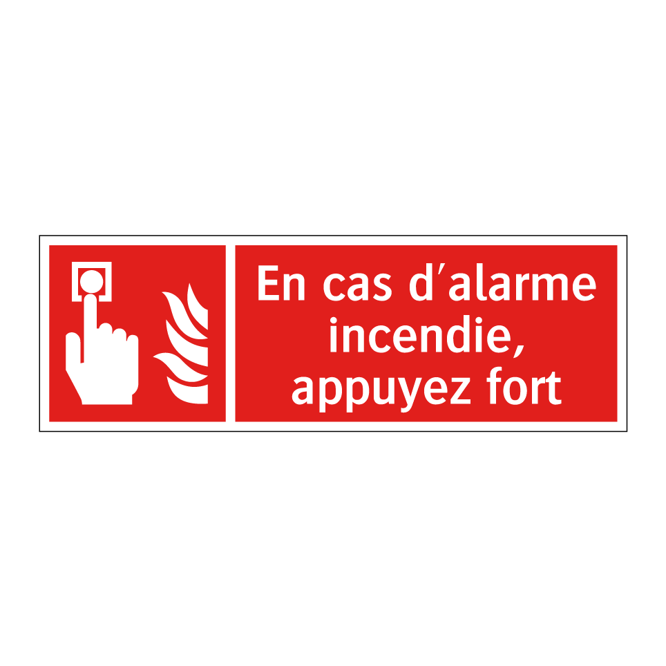 Panneau incendie avec le texte En cas d'alarme incendie, appuyez fort et une symbolique claire