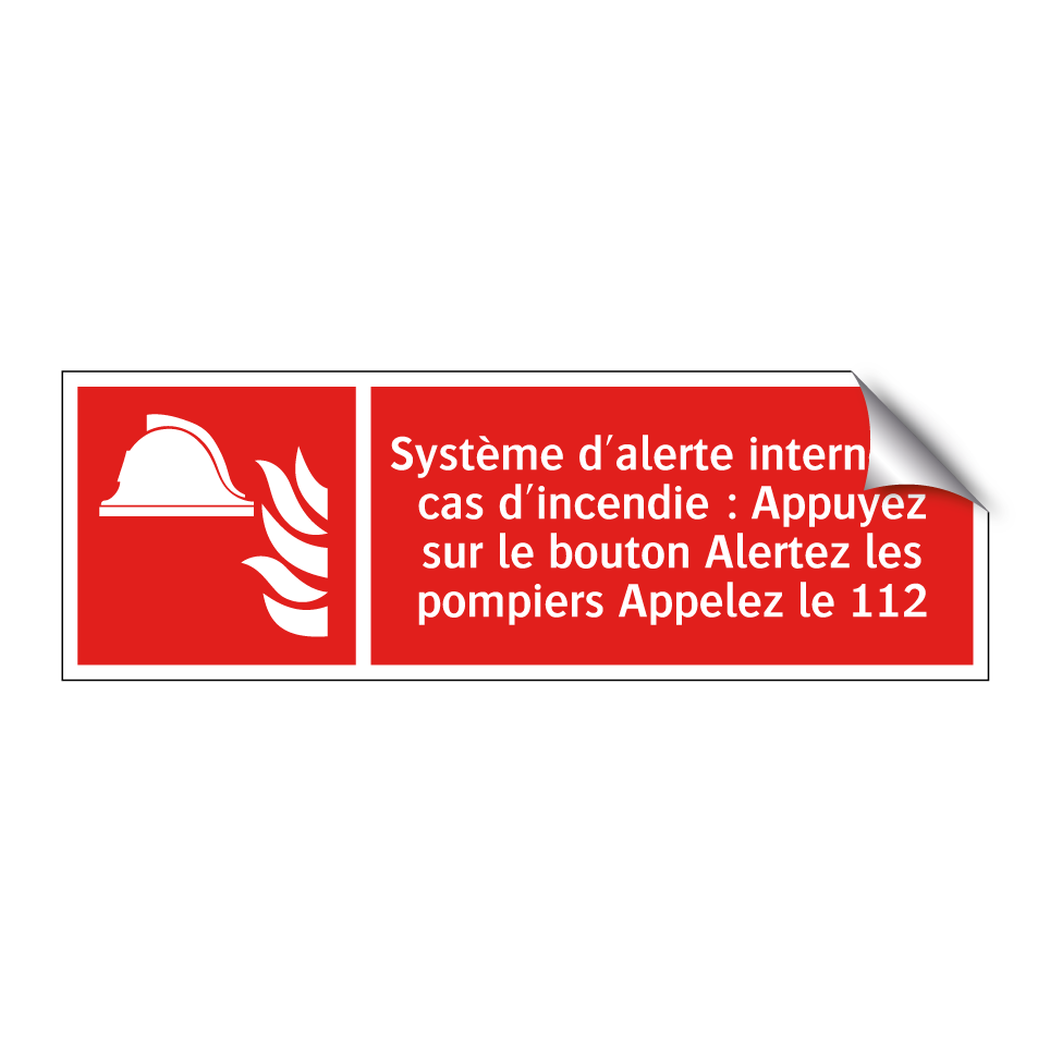 Panneau incendie avec le texte Système d'alerte interne En cas d'incendie : Appuyez sur le bouton Alertez les pompiers Appelez le 112 et une symbolique claire