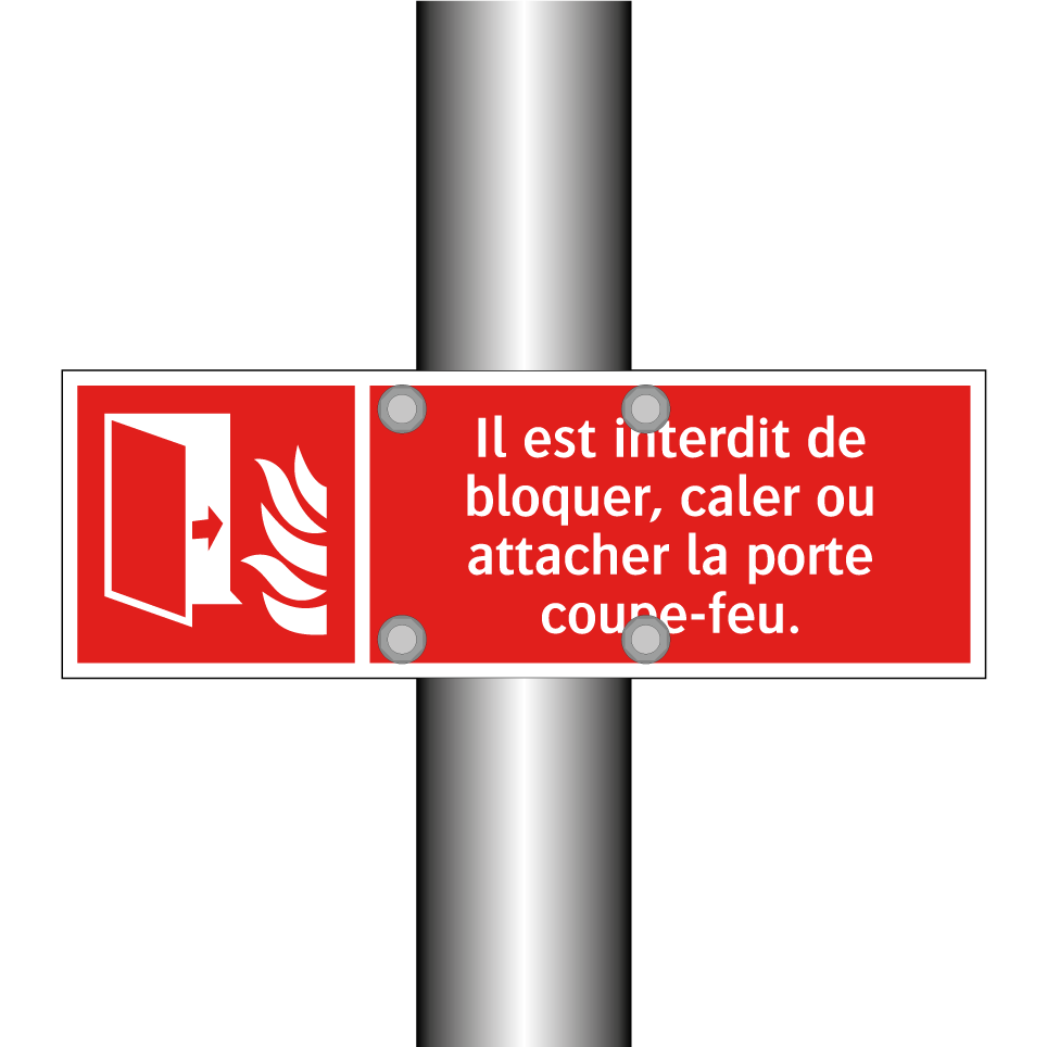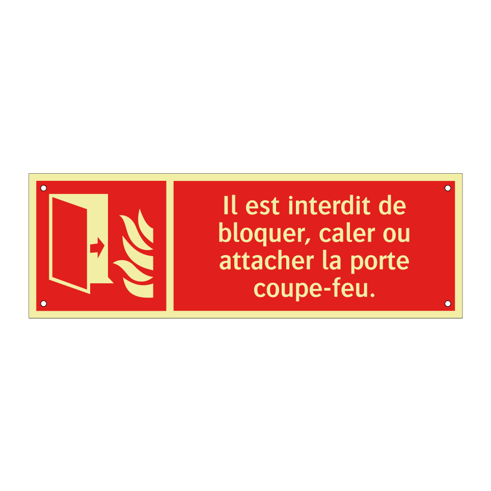 Panneau incendie avec le texte Il est interdit de bloquer, caler ou attacher la porte coupe-feu. et une symbolique claire