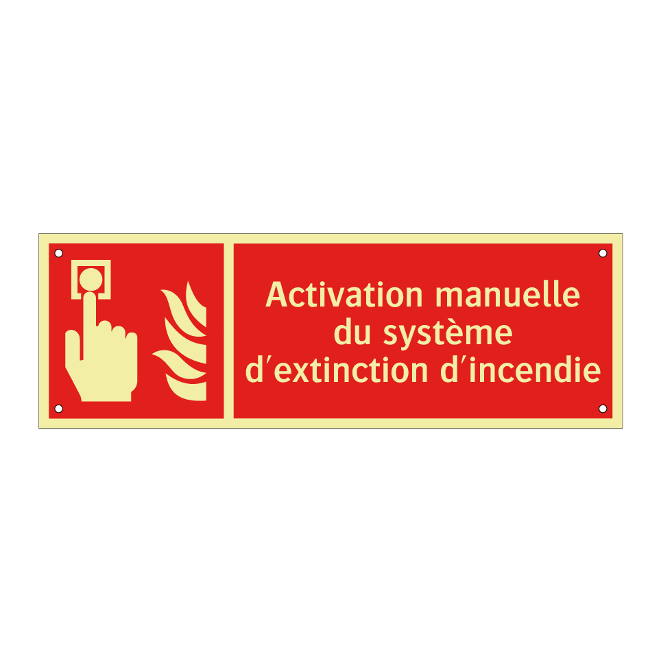 Panneau incendie avec le texte Activation manuelle du système d'extinction d'incendie et une symbolique claire