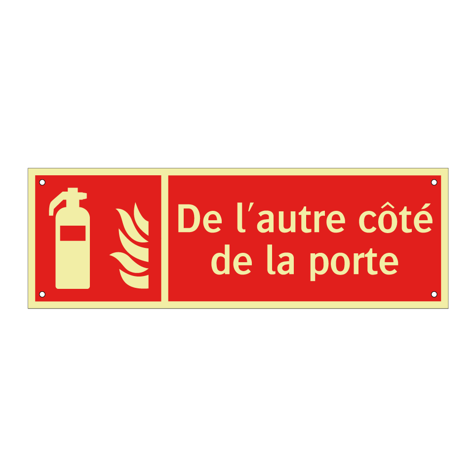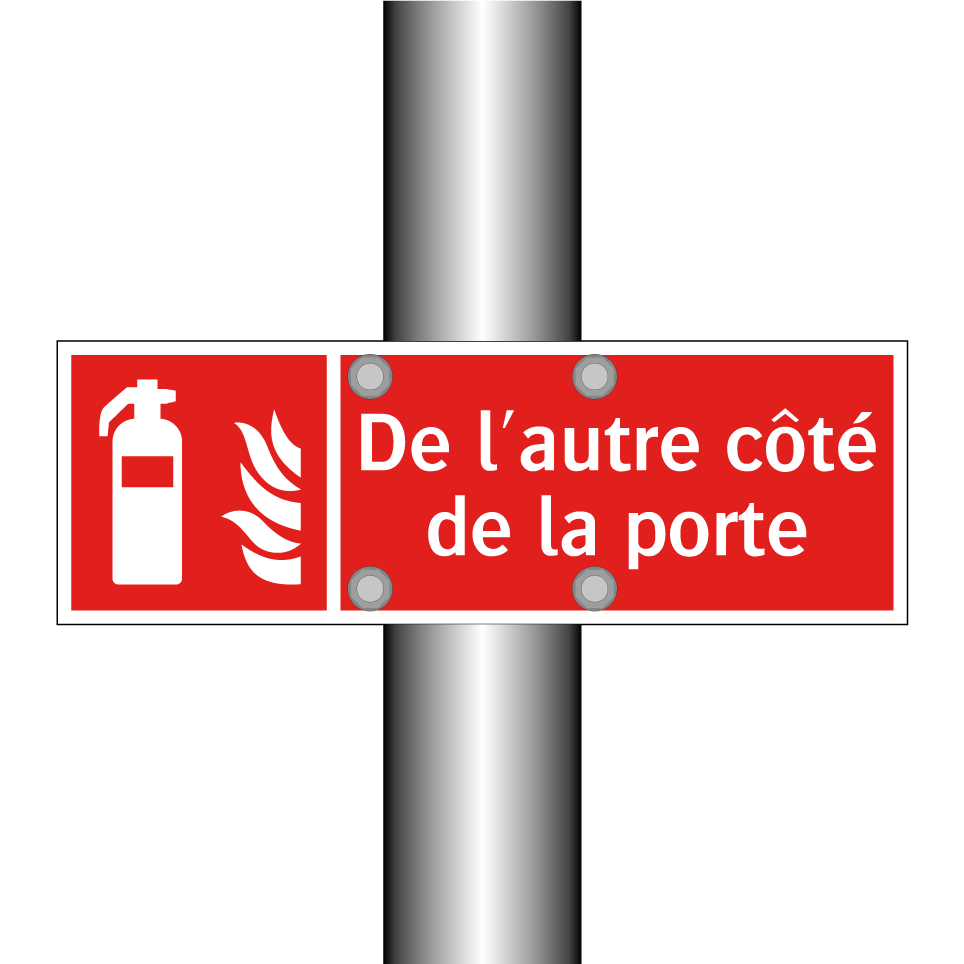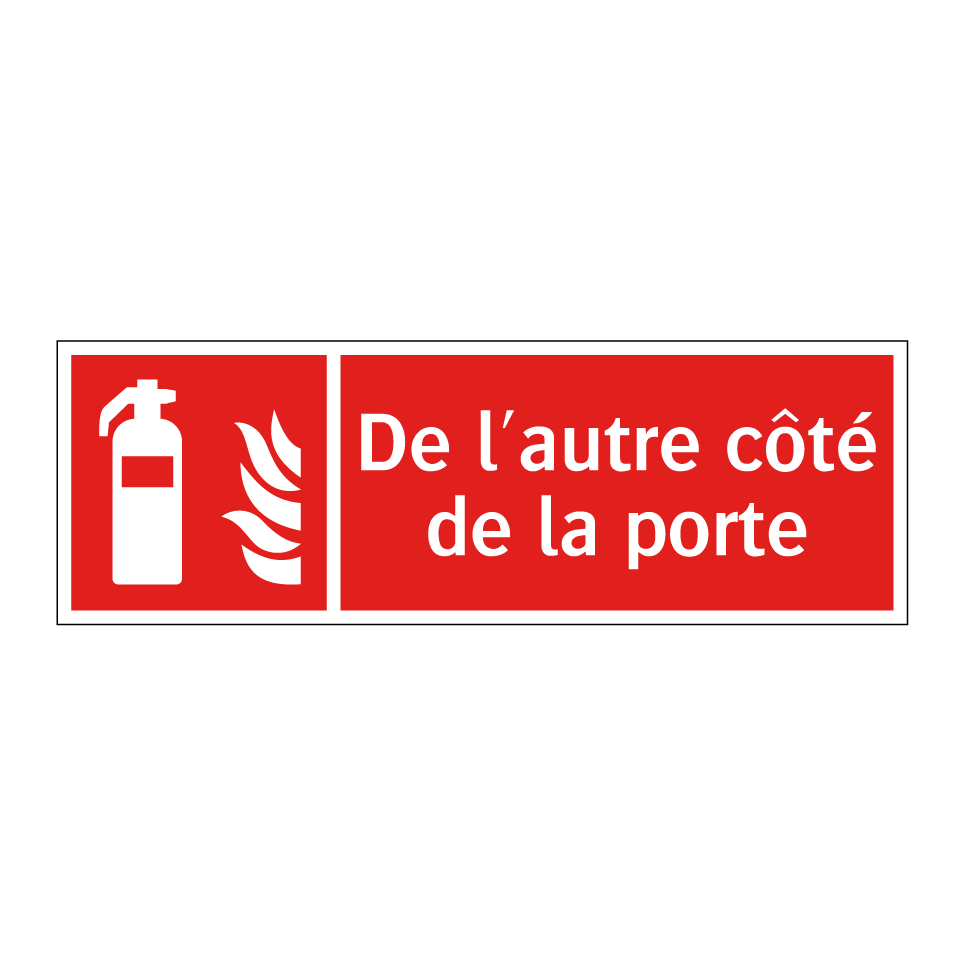 Panneau incendie avec le texte De l'autre côté de la porte et une symbolique claire