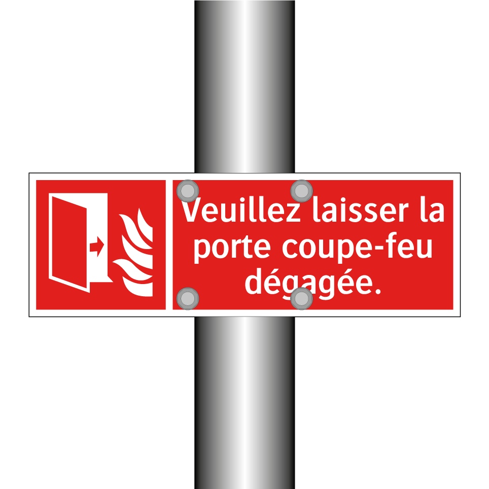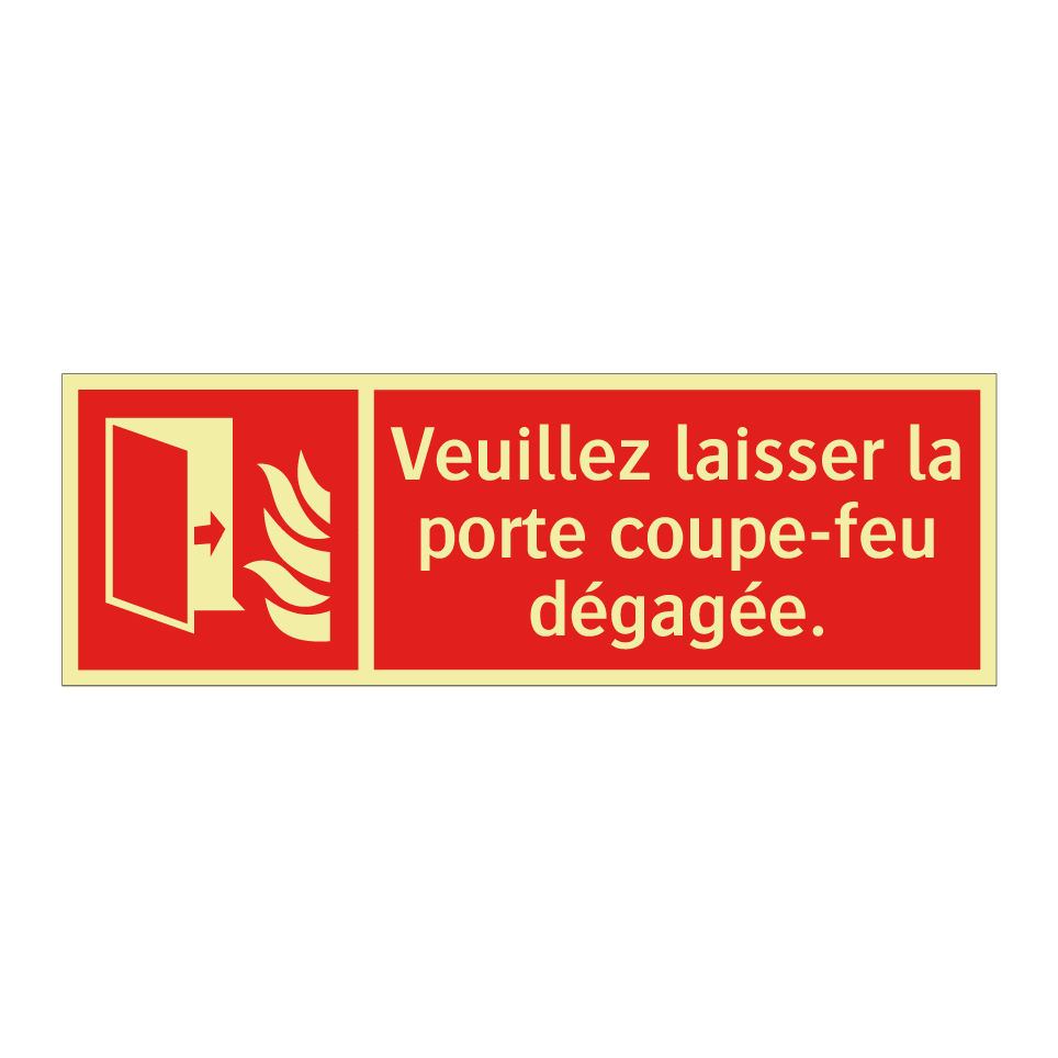 Panneau incendie avec le texte Veuillez laisser la porte coupe-feu dégagée. et une symbolique claire