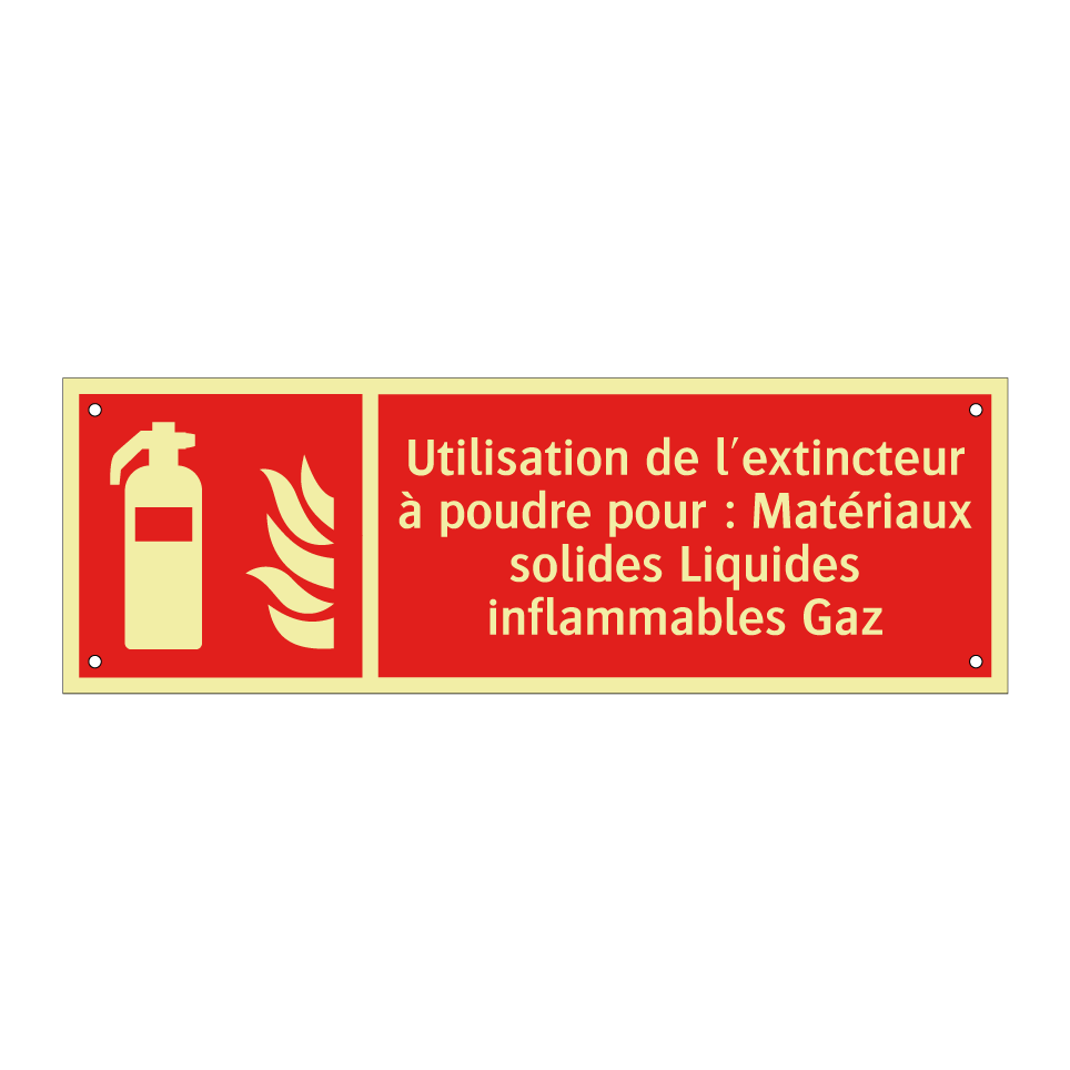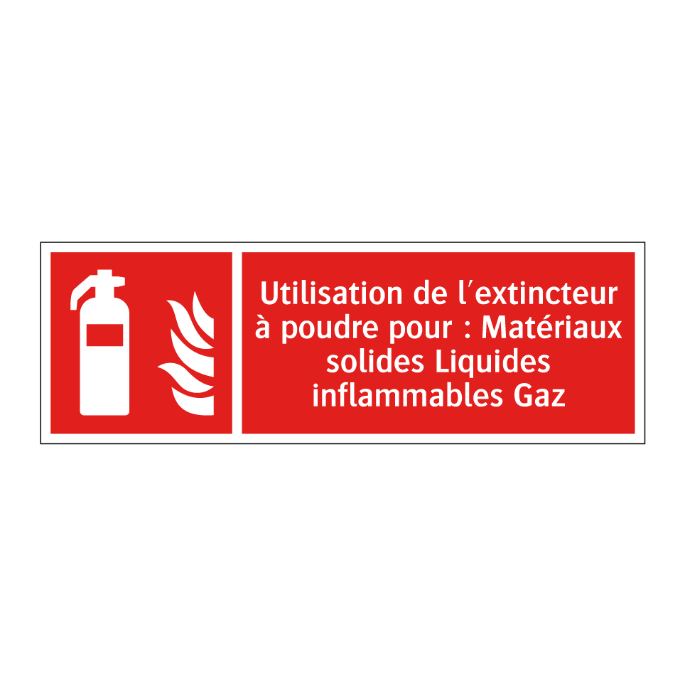 Panneau incendie avec le texte Utilisation de l'extincteur à poudre pour : Matériaux solides Liquides inflammables Gaz et une symbolique claire