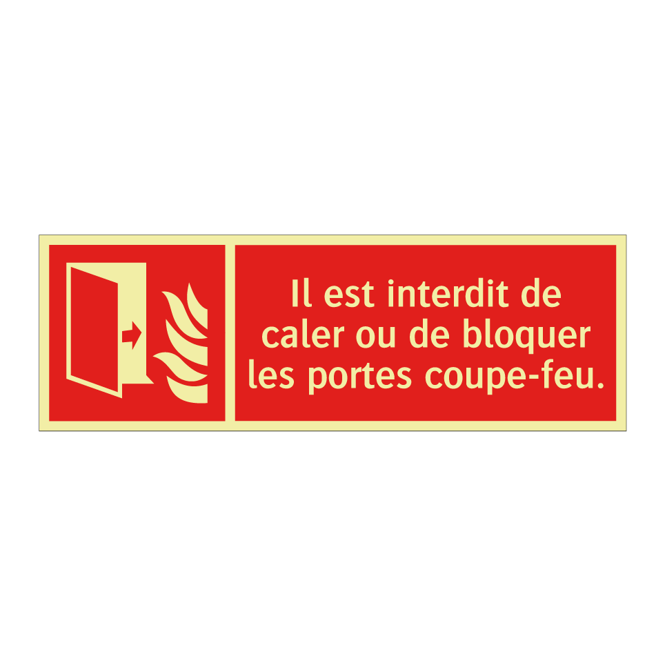 Panneau incendie avec le texte Il est interdit de caler ou de bloquer les portes coupe-feu. et une symbolique claire