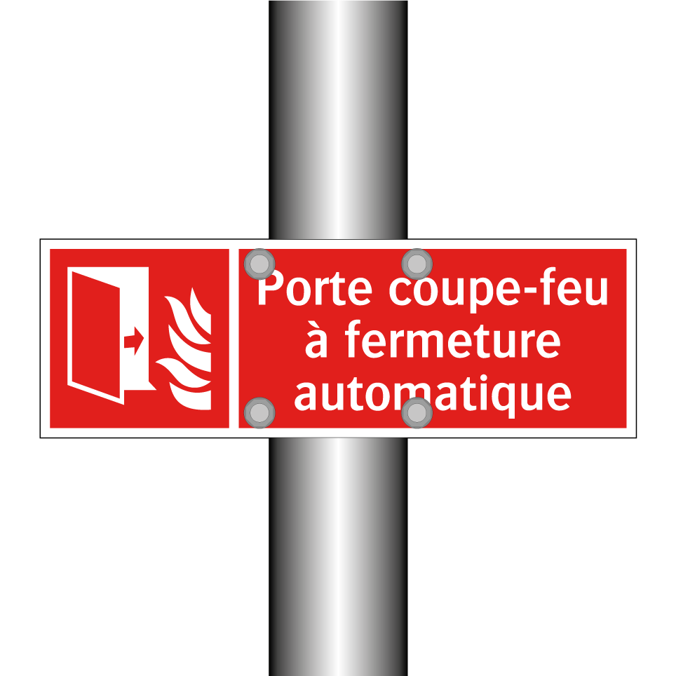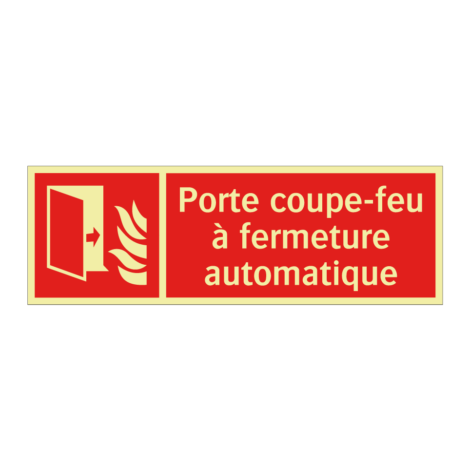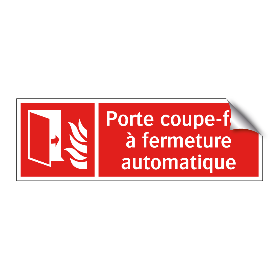 Panneau incendie avec le texte Porte coupe-feu à fermeture automatique et une symbolique claire