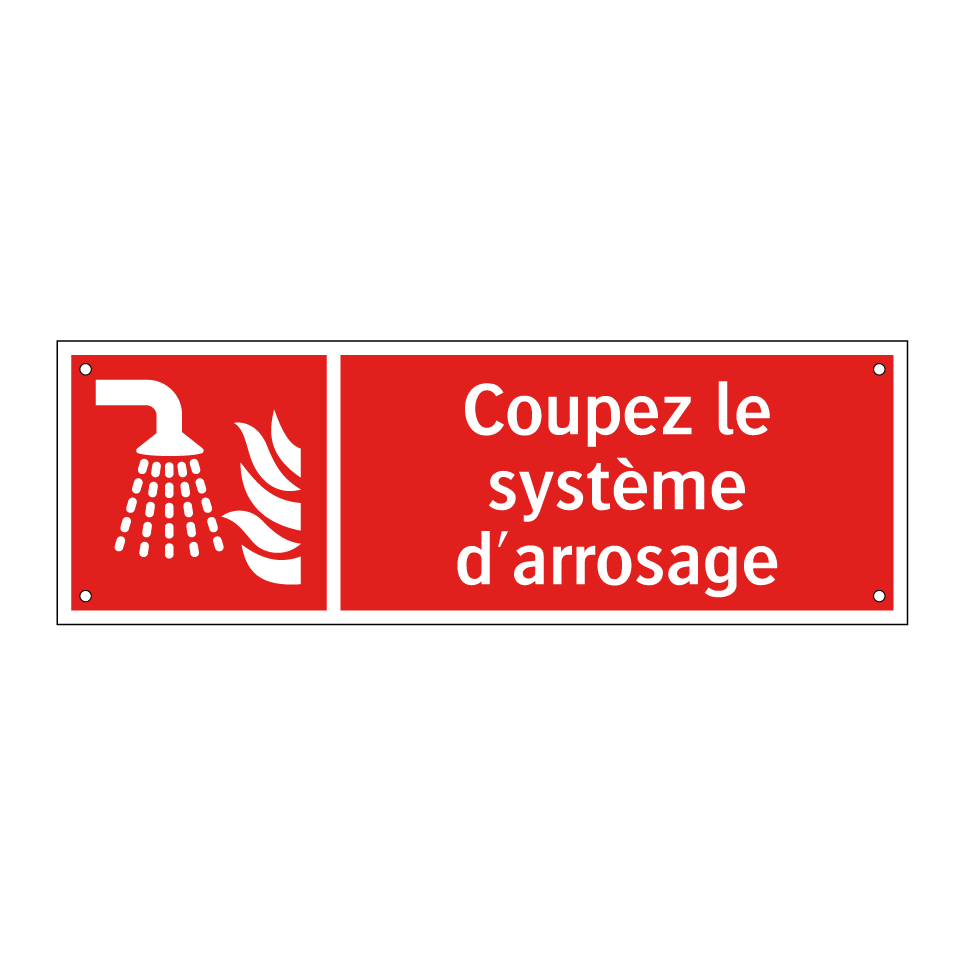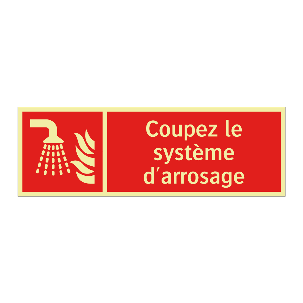 Panneau incendie avec le texte Coupez le système d'arrosage et une symbolique claire