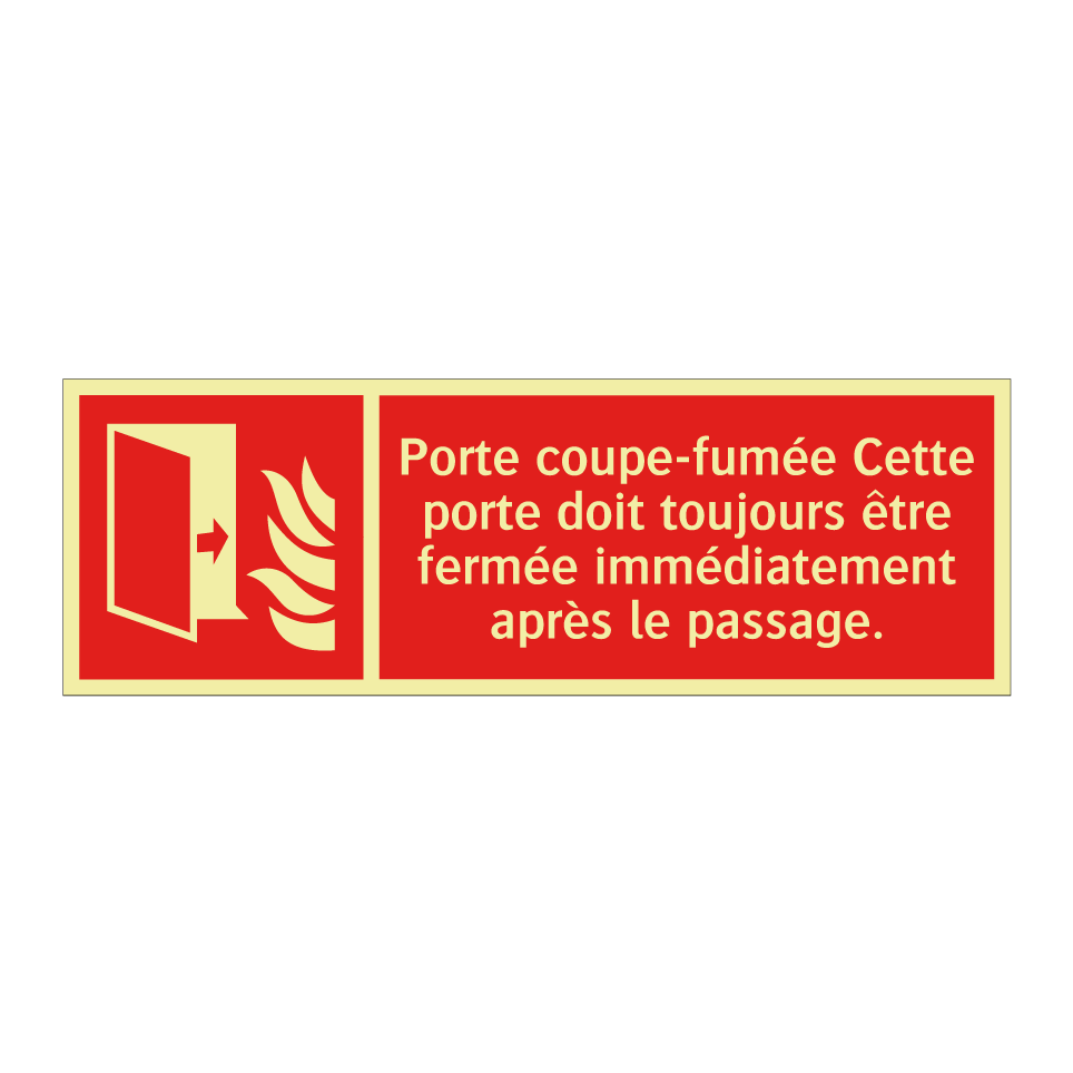 Panneau incendie avec le texte Porte coupe-fumée Cette porte doit toujours être fermée immédiatement après le passage. et une symbolique claire