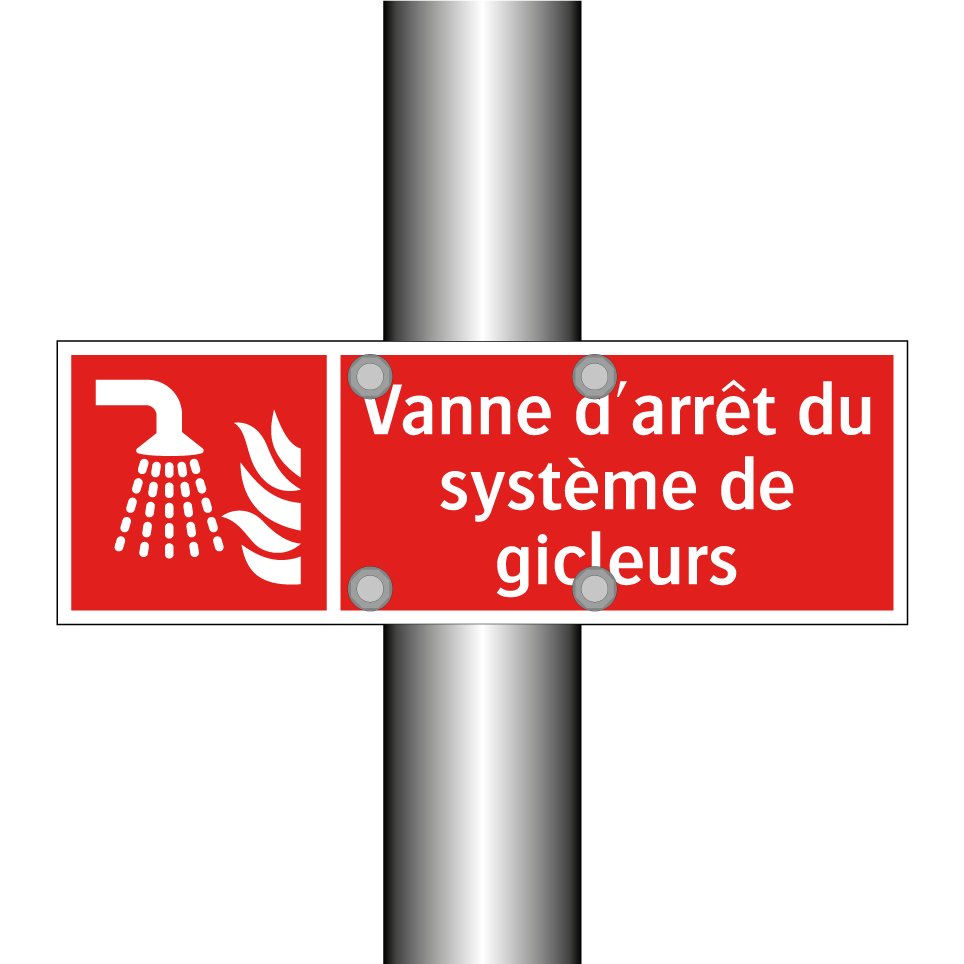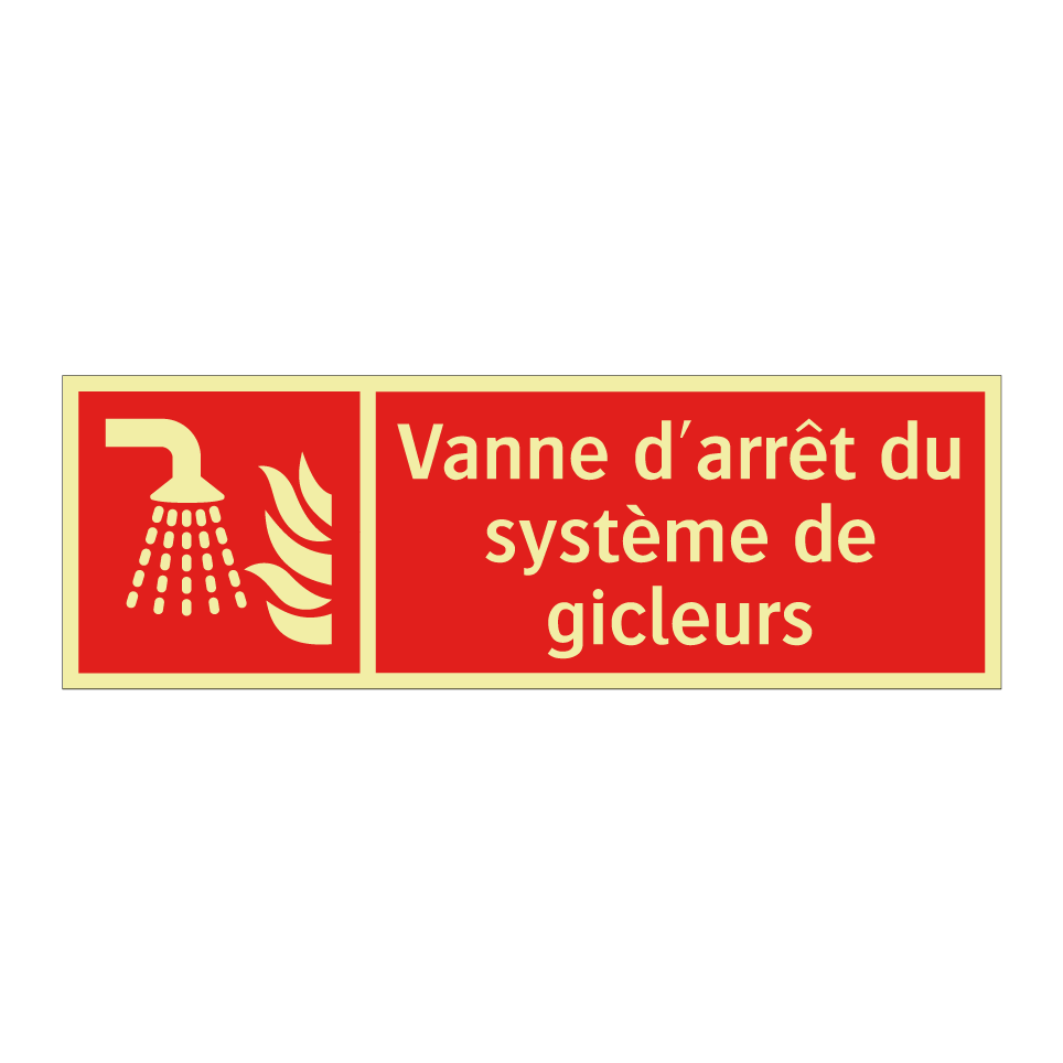 Panneau incendie avec le texte Vanne d'arrêt du système de gicleurs et une symbolique claire