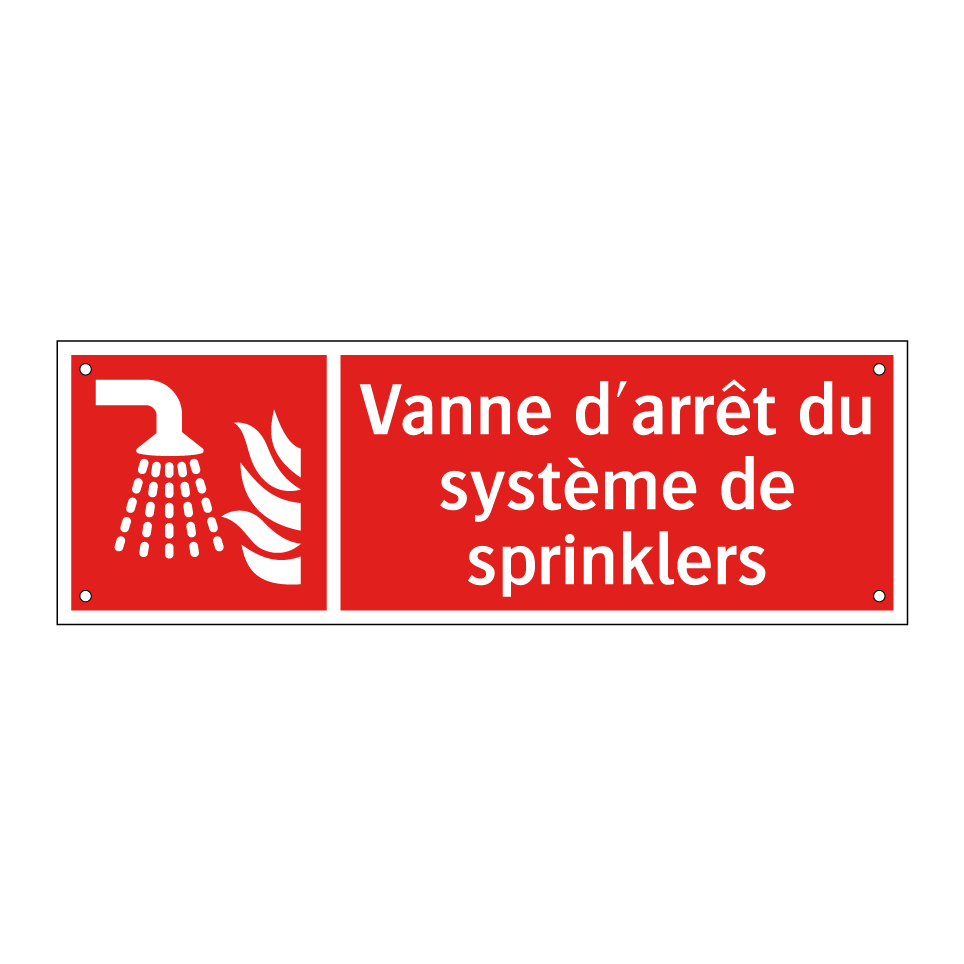 Panneau incendie avec le texte Vanne d'arrêt du système de sprinklers et une symbolique claire