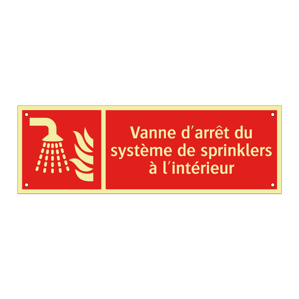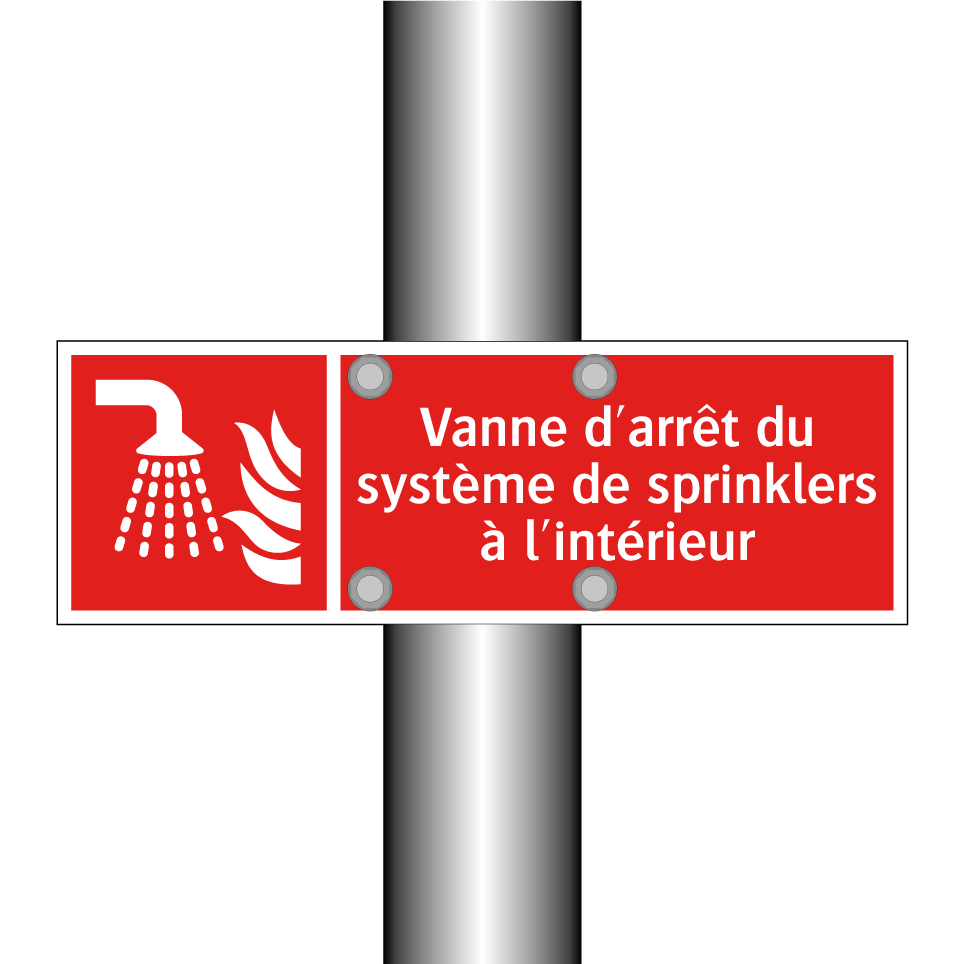 Panneau incendie avec le texte Vanne d'arrêt du système de sprinklers à l'intérieur et une symbolique claire