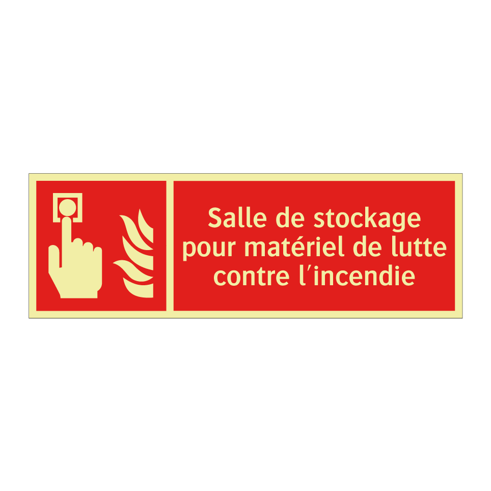 Panneau incendie avec le texte Salle de stockage pour matériel de lutte contre l'incendie et une symbolique claire
