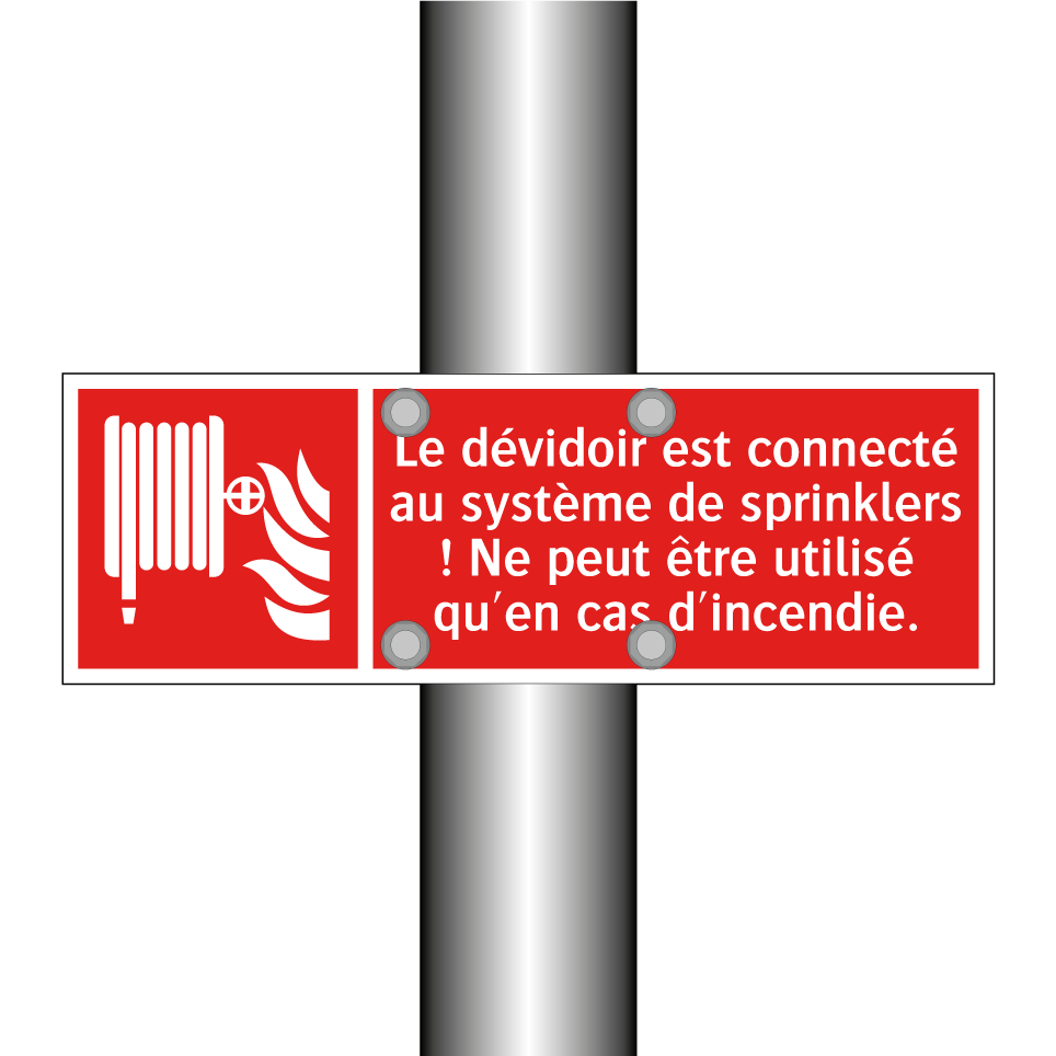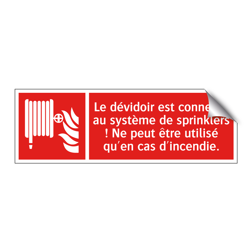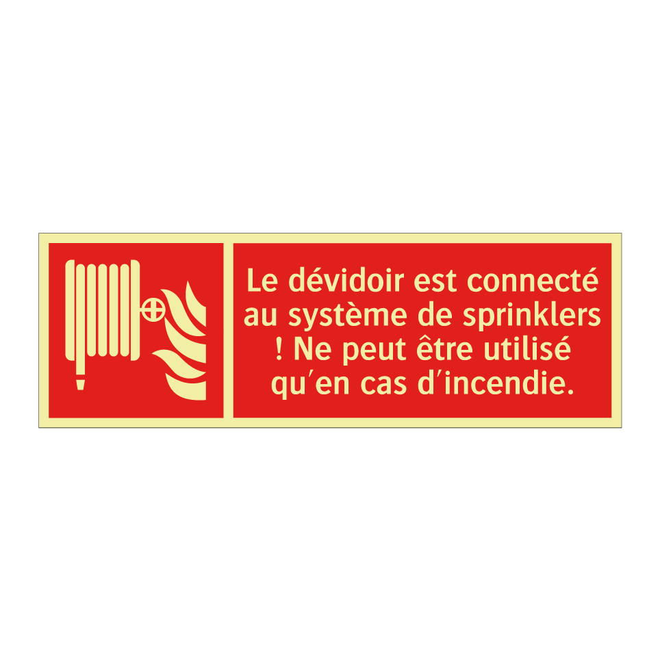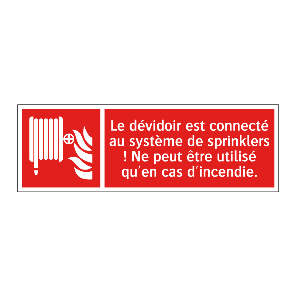 Panneau incendie avec le texte Le dévidoir est connecté au système de sprinklers ! Ne peut être utilisé qu'en cas d'incendie. et une symbolique claire
