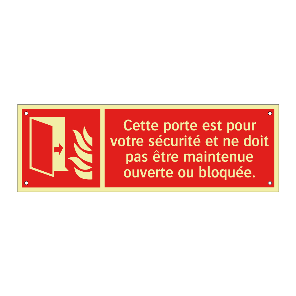 Panneau incendie avec le texte Cette porte est pour votre sécurité et ne doit pas être maintenue ouverte ou bloquée. et une symbolique claire