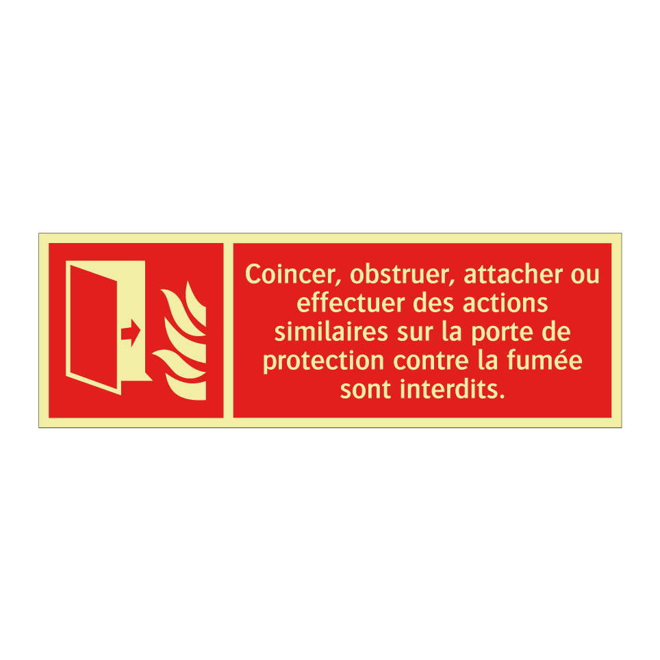 Panneau incendie avec le texte Coincer, obstruer, attacher ou effectuer des actions similaires sur la porte de protection contre la fumée sont interdits. et une symbolique claire