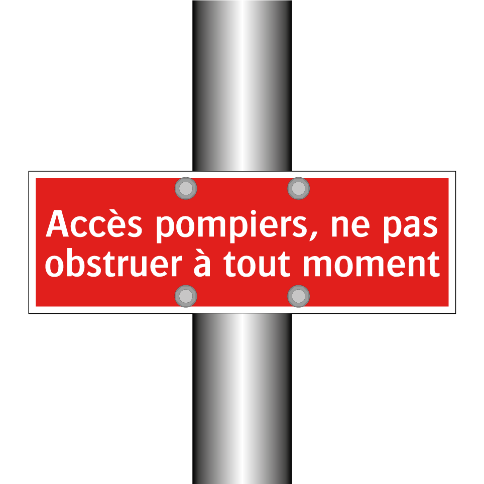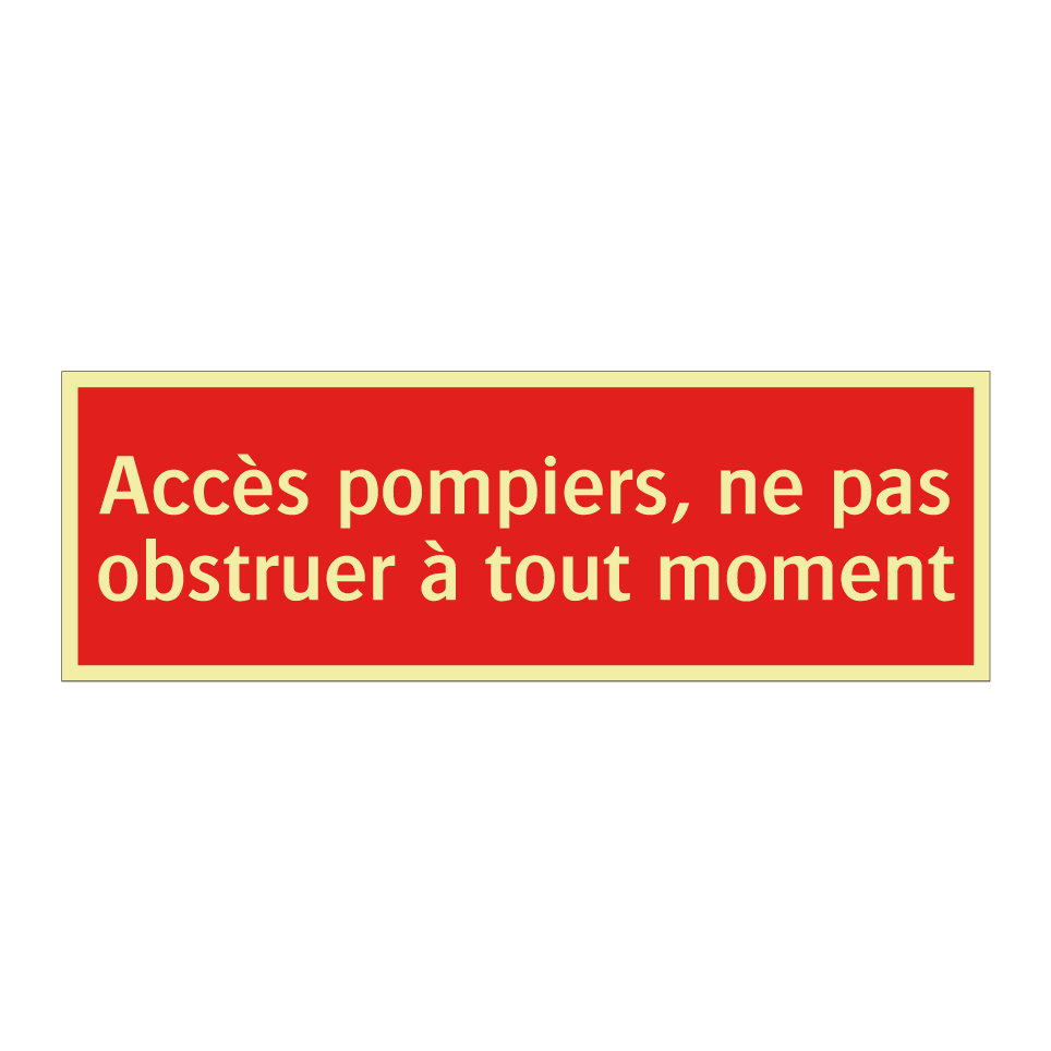 Panneau de signalisation incendie avec le texte Accès pompiers, ne pas obstruer à tout moment
