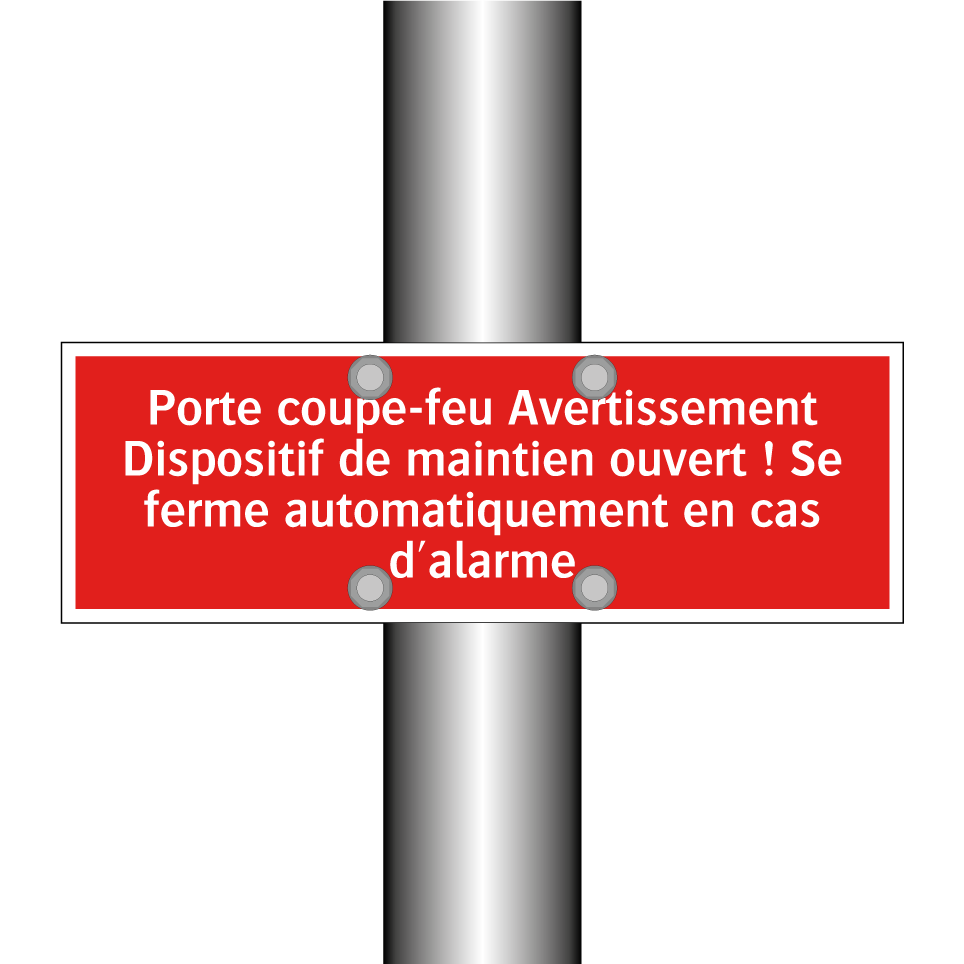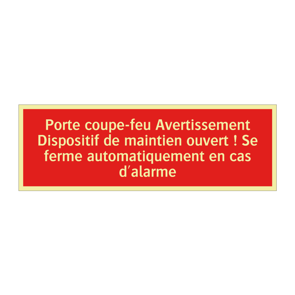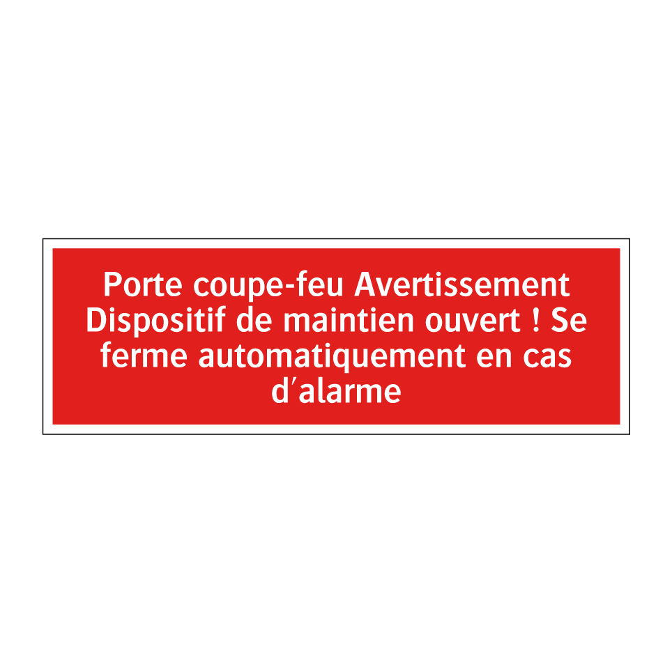 Panneau de signalisation incendie avec le texte Porte coupe-feu Avertissement Dispositif de maintien ouvert ! Se ferme automatiquement en cas d'alarme