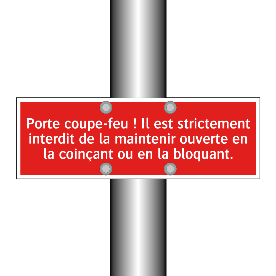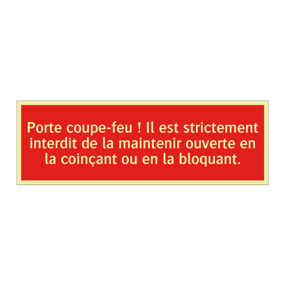 Panneau de signalisation incendie avec le texte Porte coupe-feu ! Il est strictement interdit de la maintenir ouverte en la coinçant ou en la bloquant.