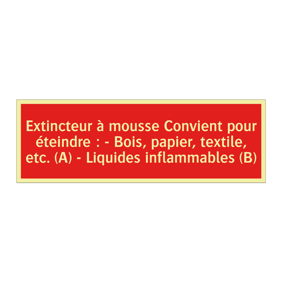 Panneau de signalisation incendie avec le texte Extincteur à mousse Convient pour éteindre : - Bois, papier, textile, etc. (A) - Liquides inflammables (B)
