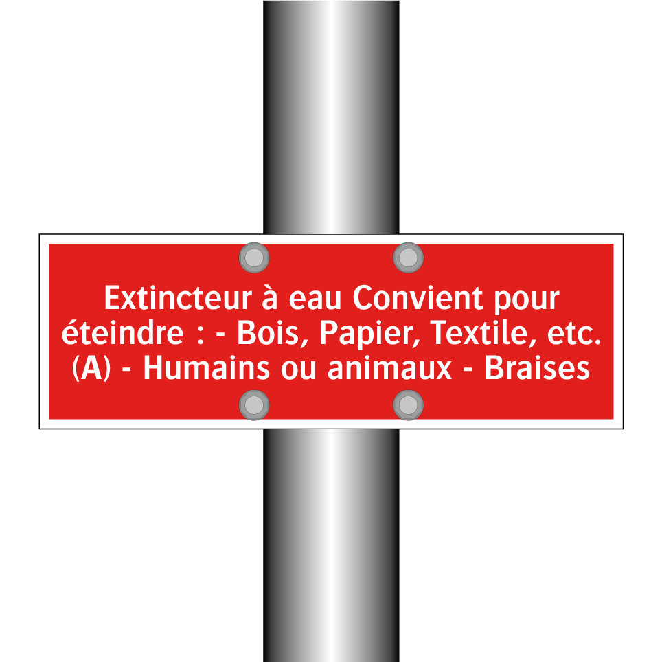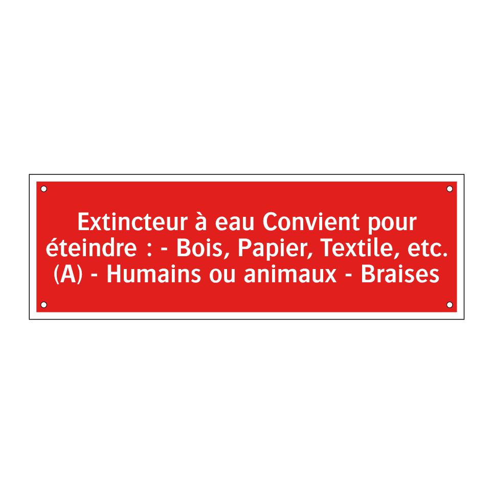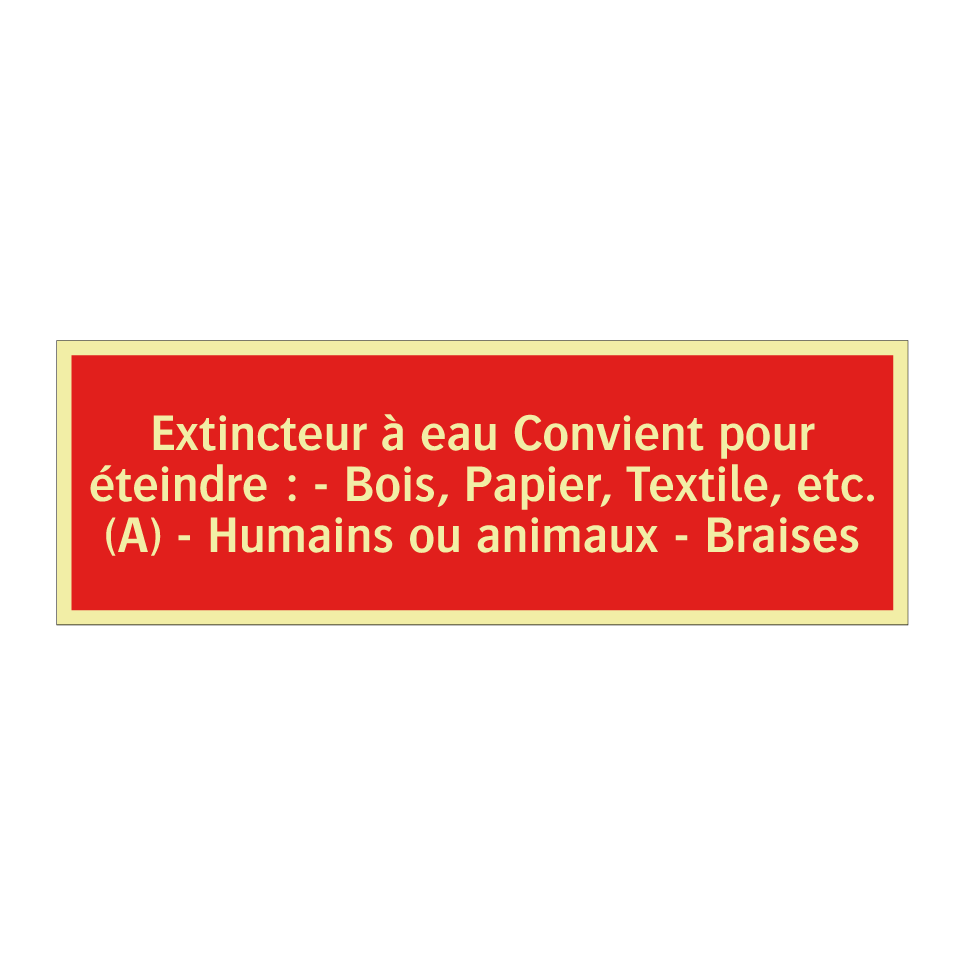 Panneau de signalisation incendie avec le texte Extincteur à eau Convient pour éteindre : - Bois, Papier, Textile, etc. (A) - Humains ou animaux - Braises