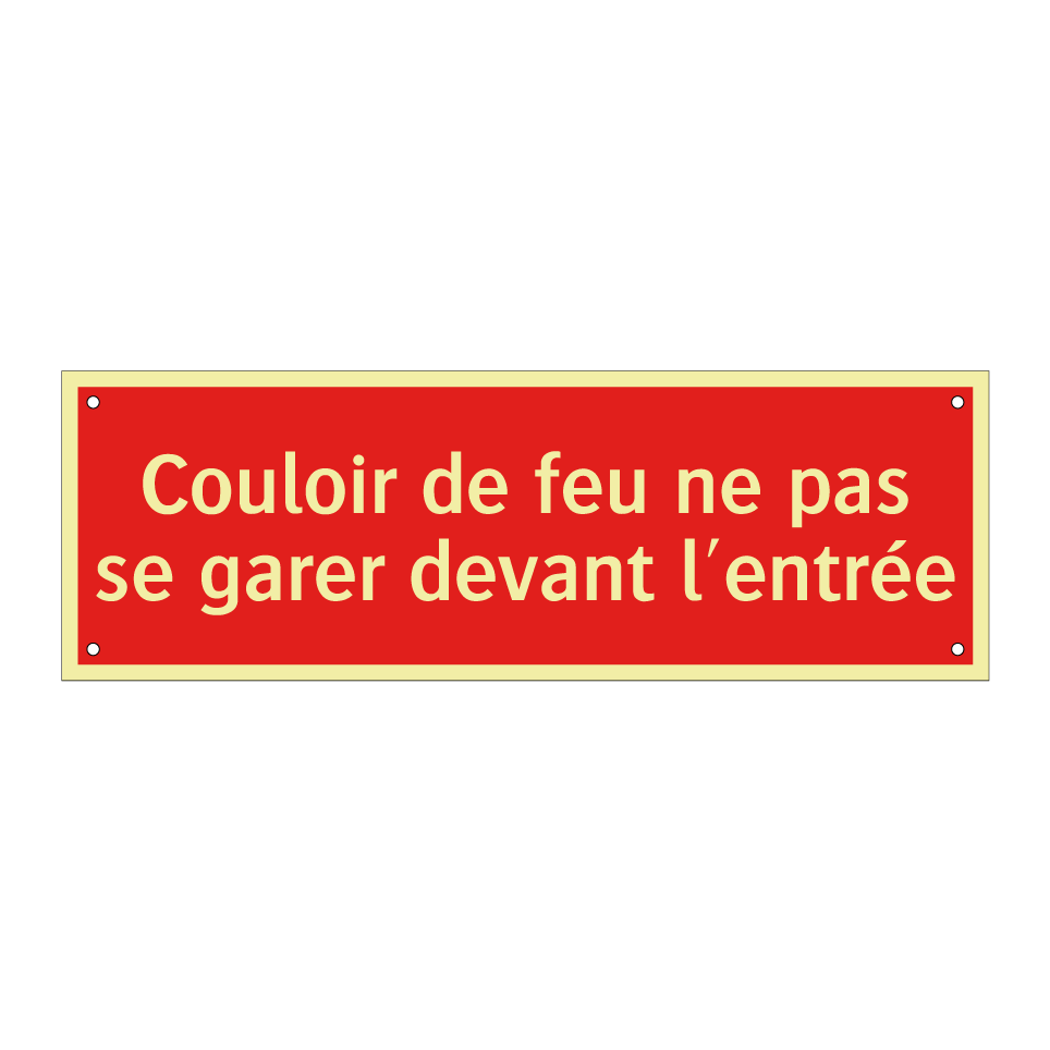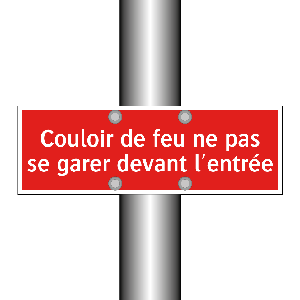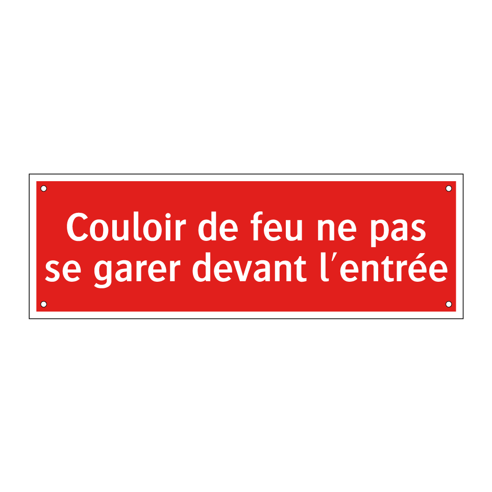 Panneau de signalisation incendie avec le texte Couloir de feu ne pas se garer devant l'entrée