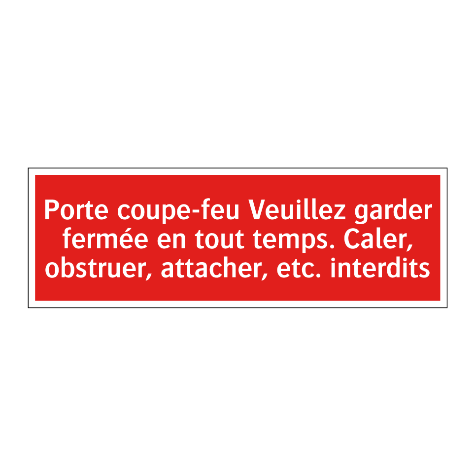 Panneau de signalisation incendie avec le texte Porte coupe-feu Veuillez garder fermée en tout temps. Caler, obstruer, attacher, etc. interdits