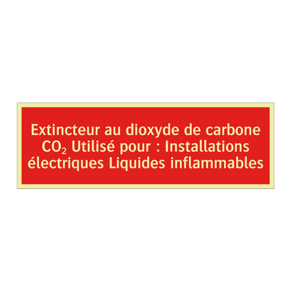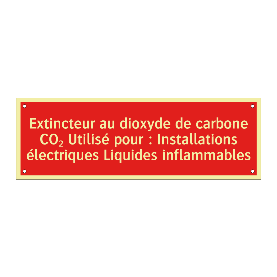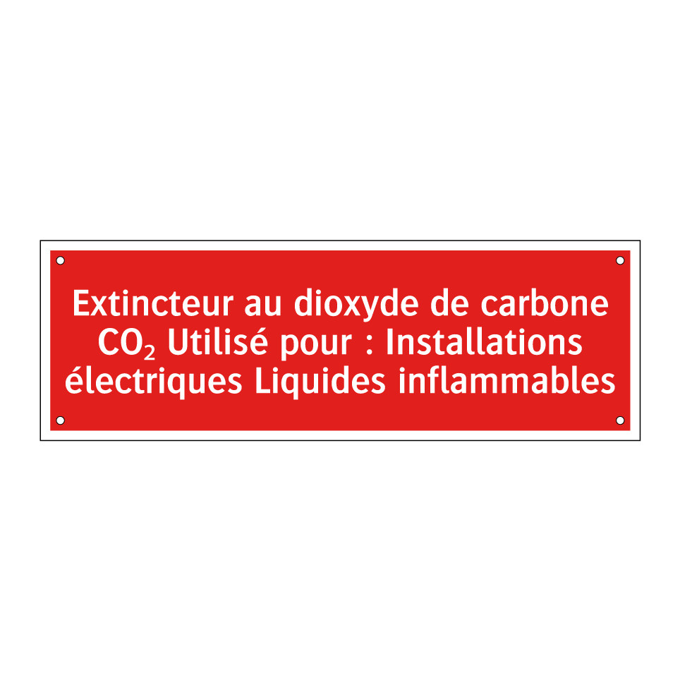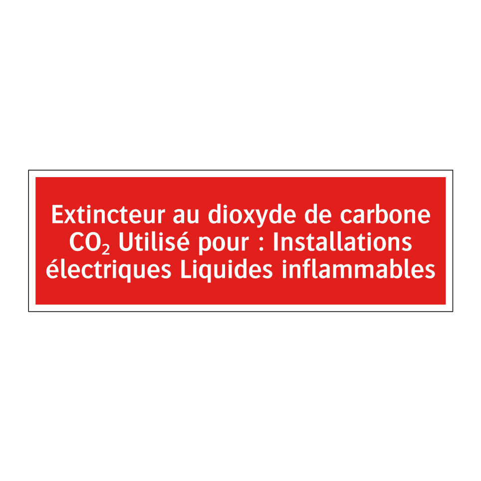 Panneau de signalisation incendie avec le texte Extincteur au dioxyde de carbone CO₂ Utilisé pour : Installations électriques Liquides inflammables
