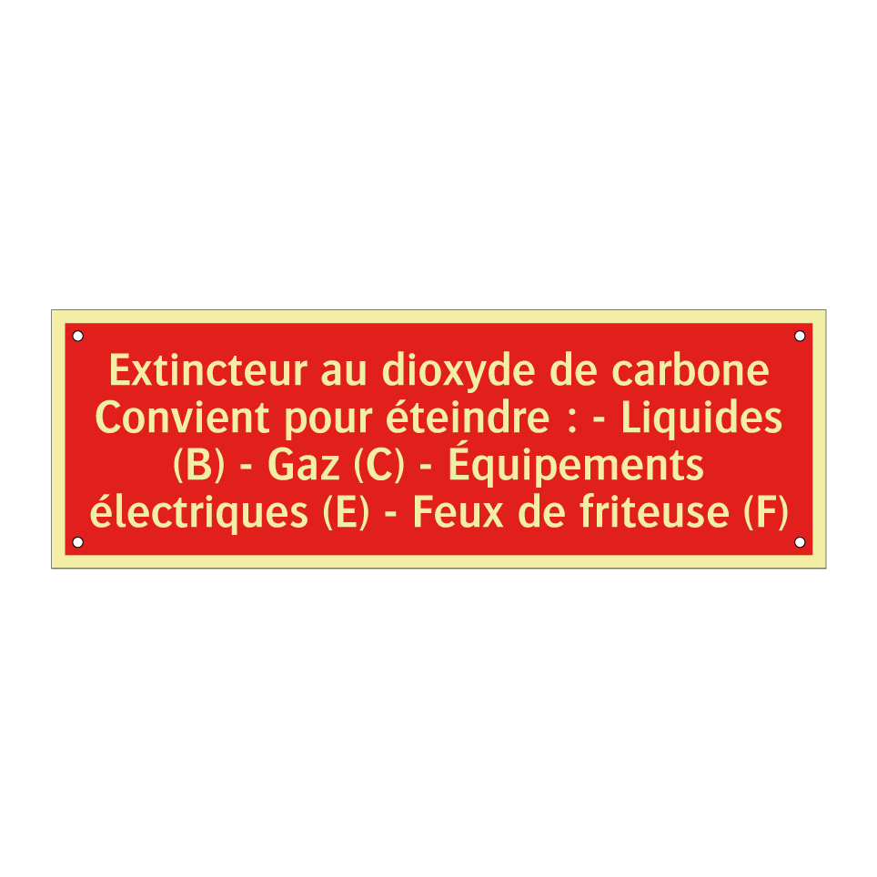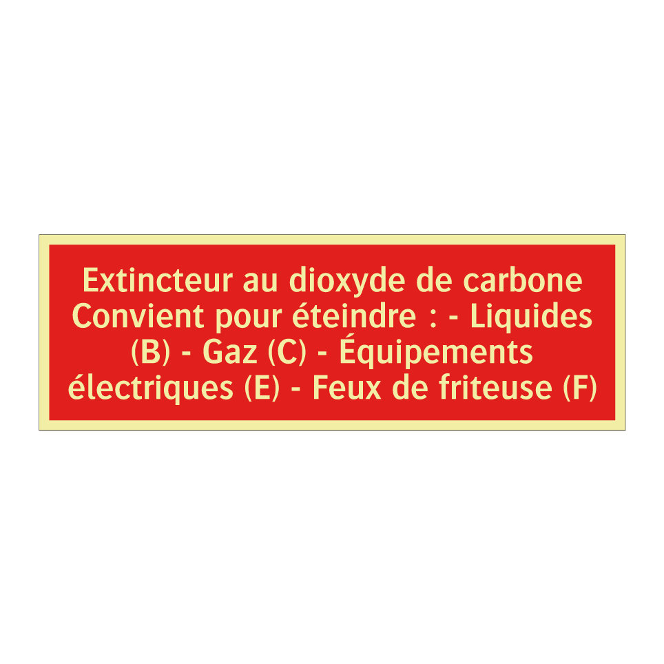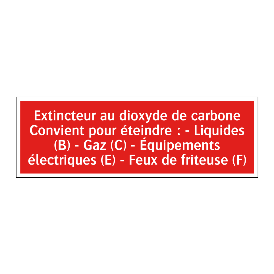 Panneau de signalisation incendie avec le texte Extincteur au dioxyde de carbone Convient pour éteindre : - Liquides (B) - Gaz (C) - Équipements électriques (E) - Feux de friteuse (F)