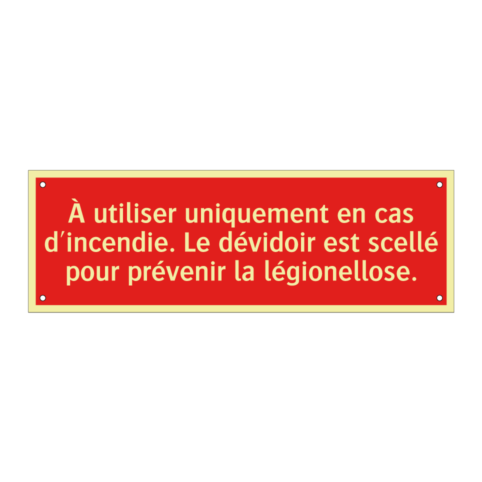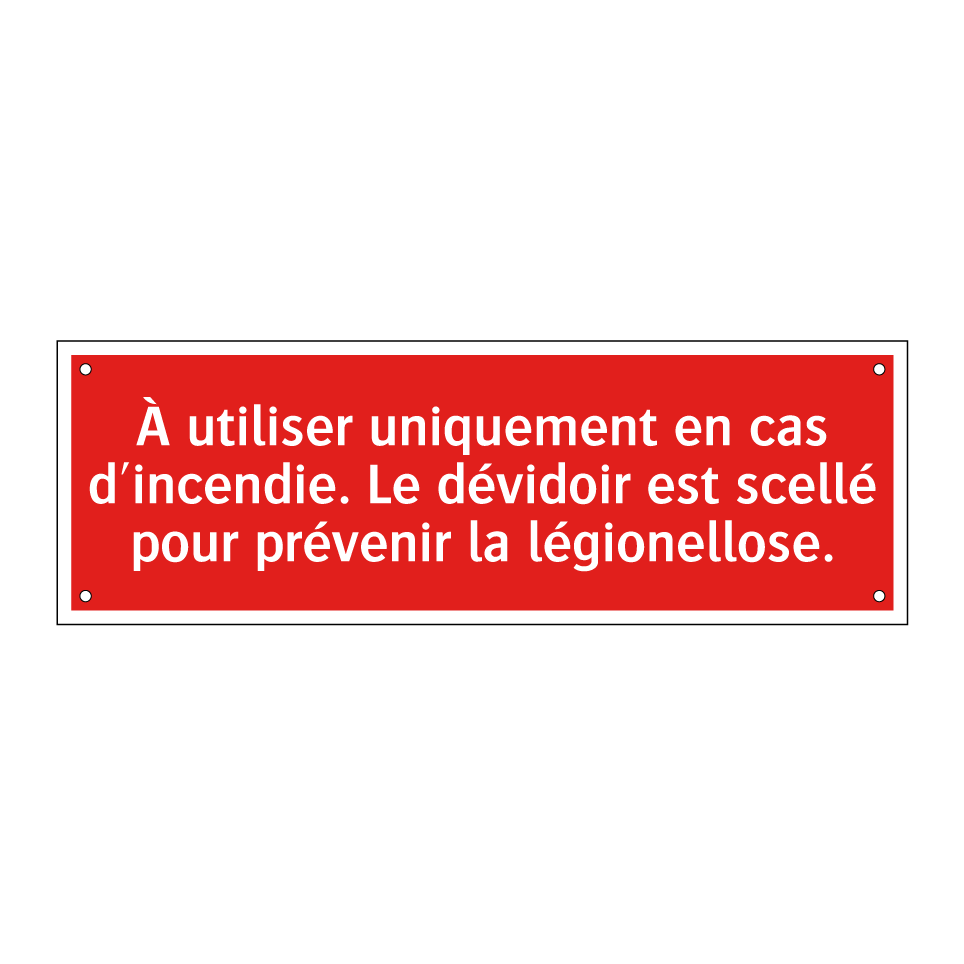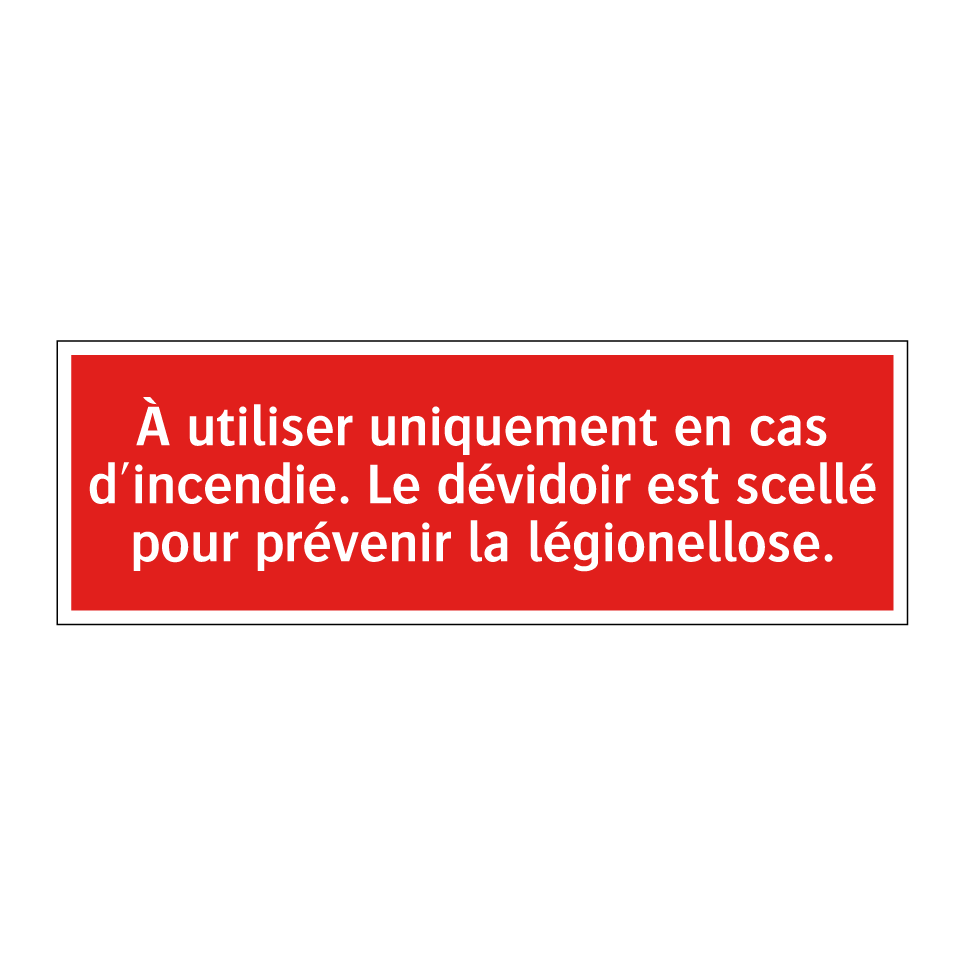 Panneau de signalisation incendie avec le texte À utiliser uniquement en cas d'incendie. Le dévidoir est scellé pour prévenir la légionellose.