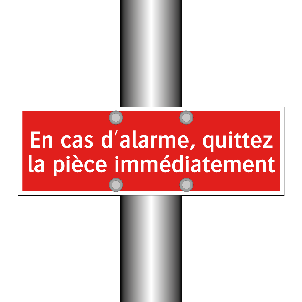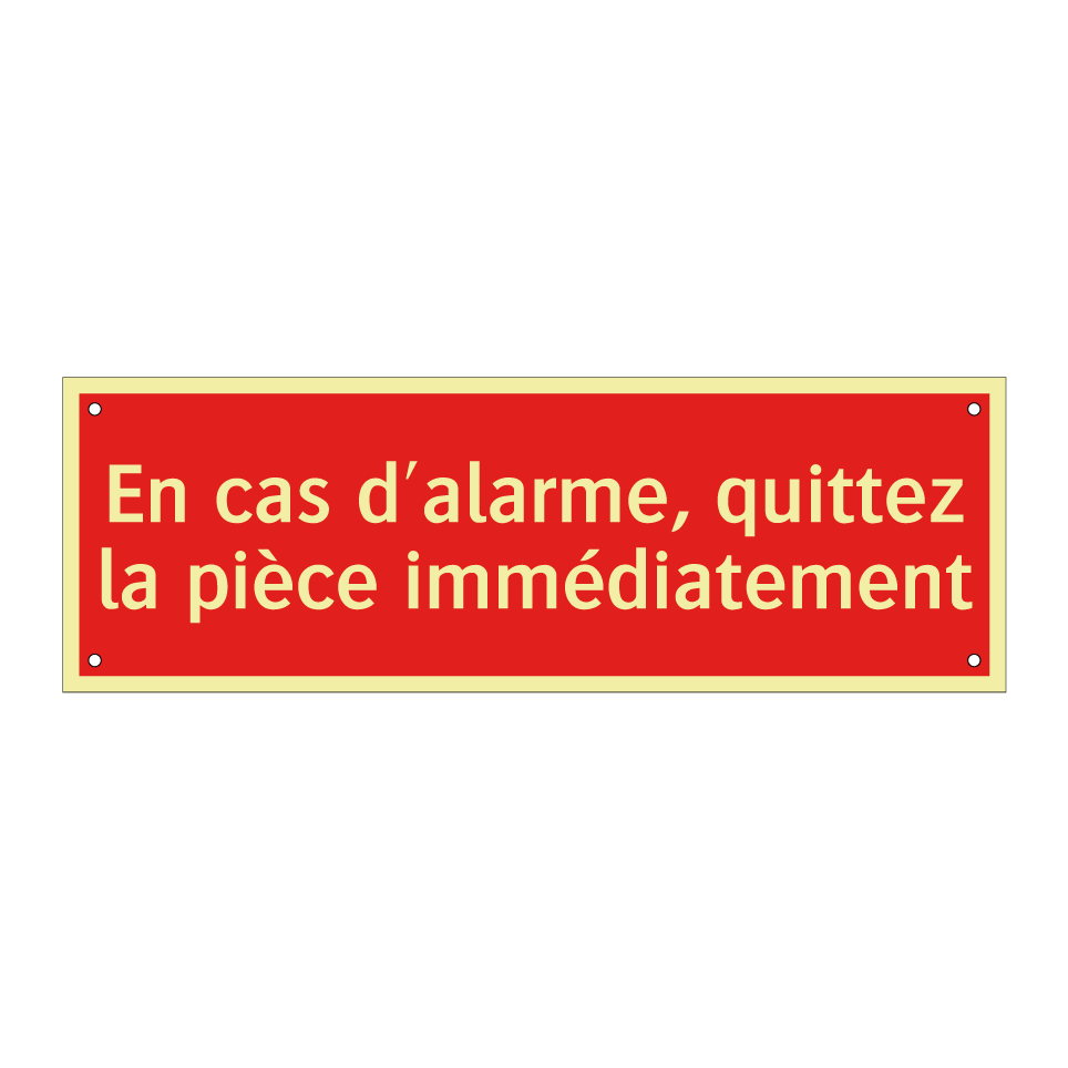 Panneau de signalisation incendie avec le texte En cas d'alarme, quittez la pièce immédiatement