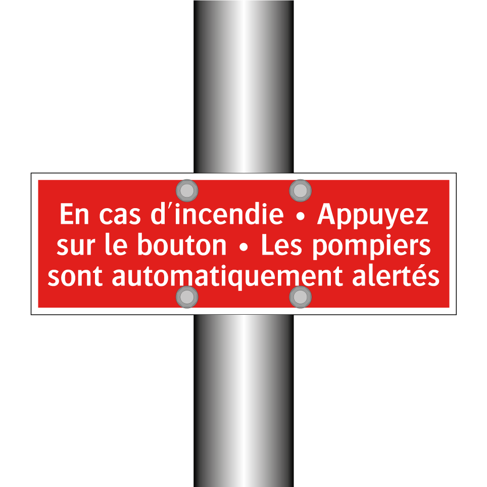 Panneau de signalisation incendie avec le texte En cas d'incendie • Appuyez sur le bouton • Les pompiers sont automatiquement alertés