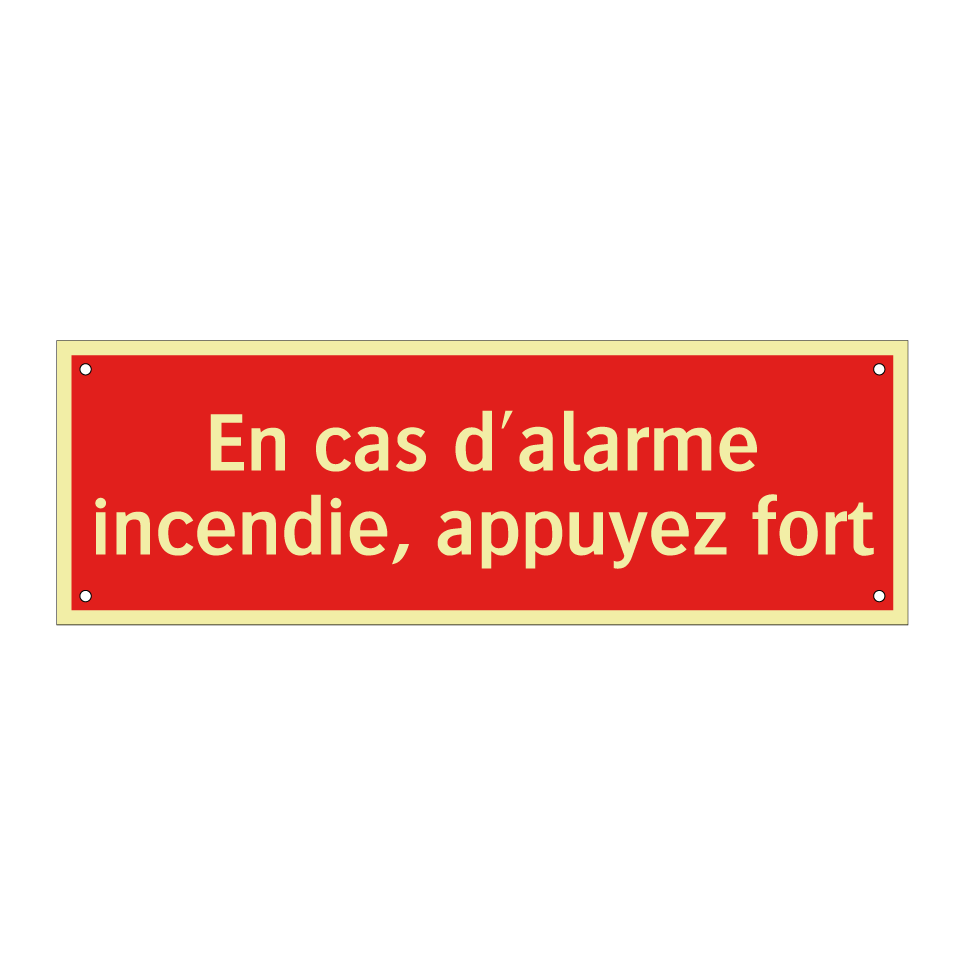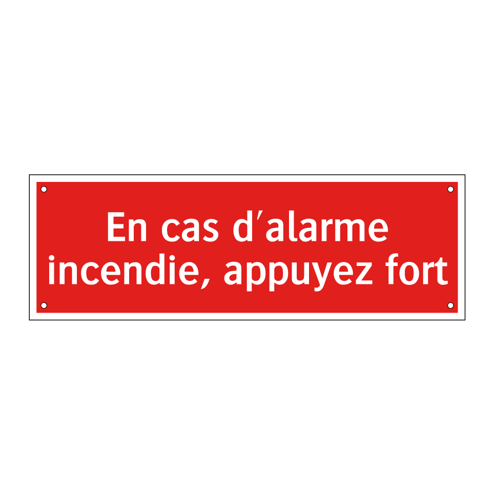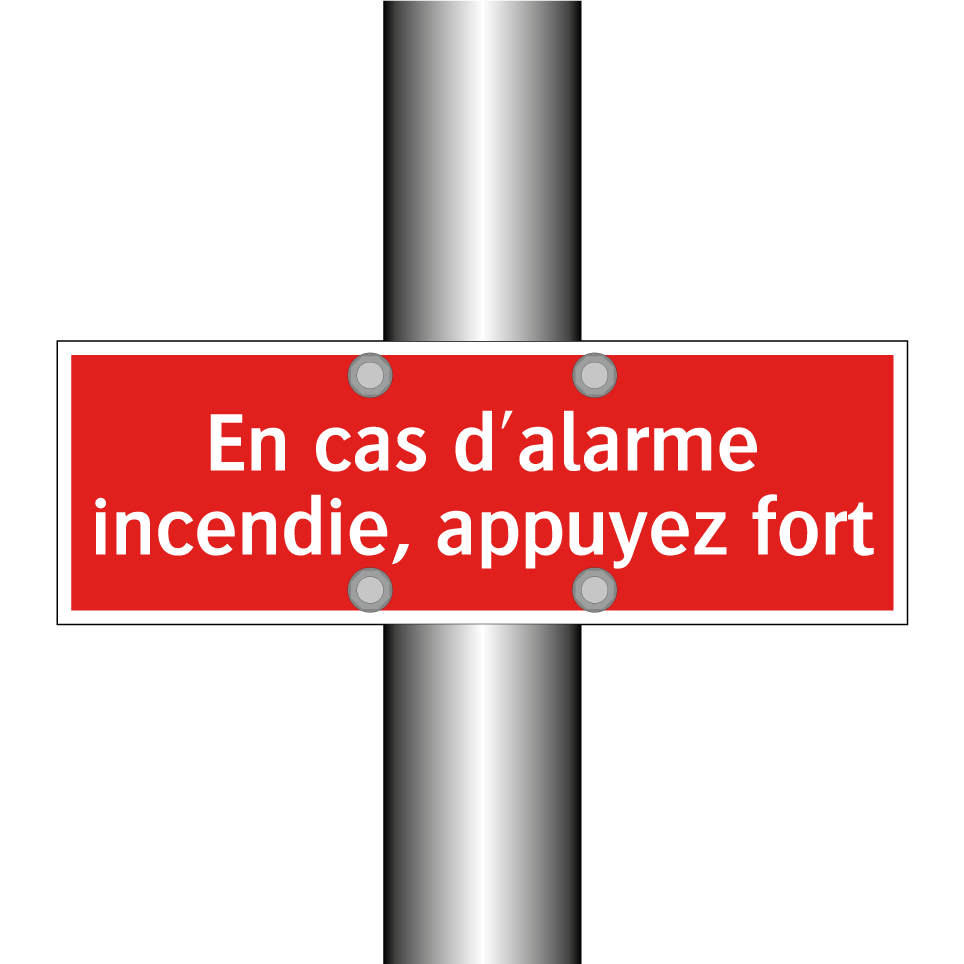 Panneau de signalisation incendie avec le texte En cas d'alarme incendie, appuyez fort