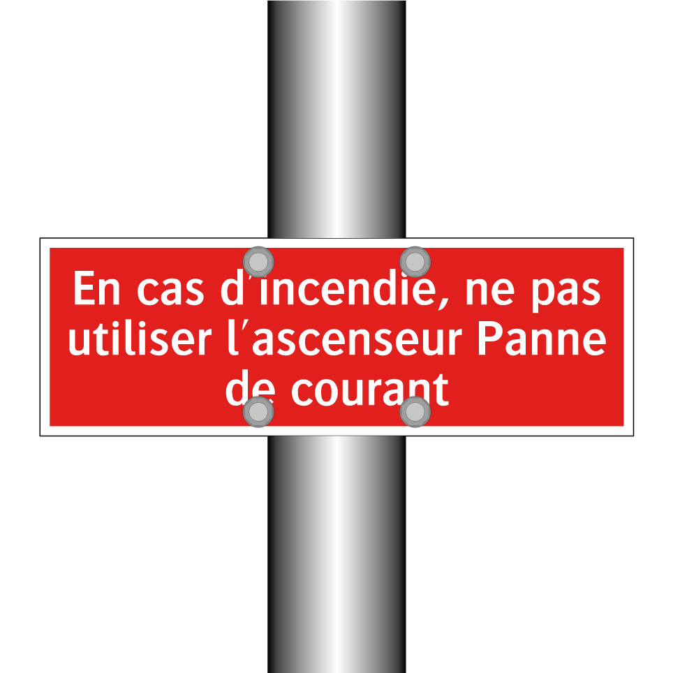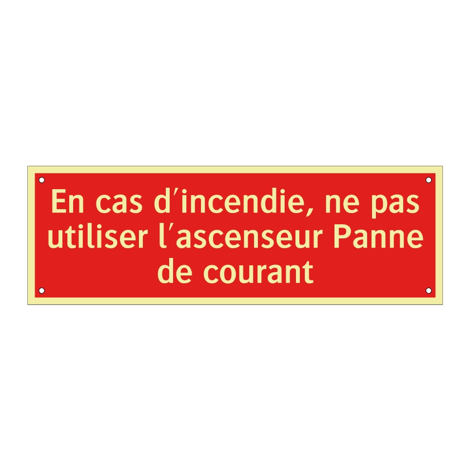 Panneau de signalisation incendie avec le texte En cas d'incendie, ne pas utiliser l'ascenseur Panne de courant