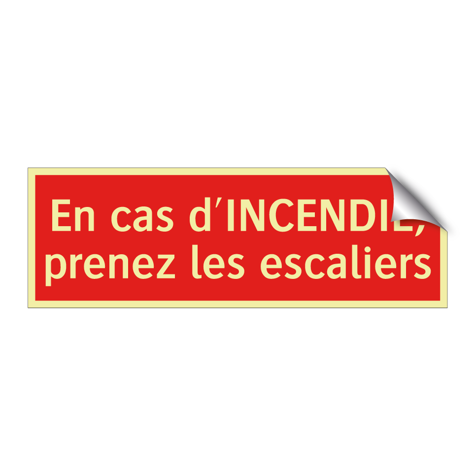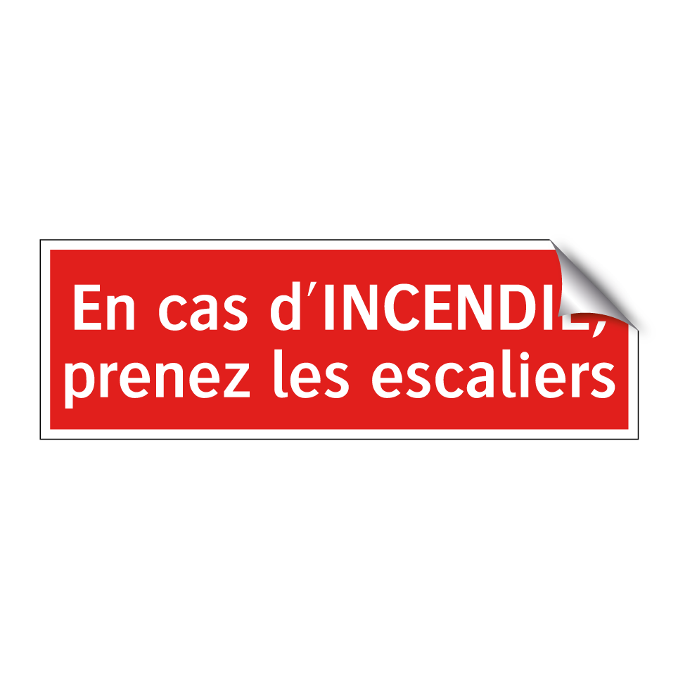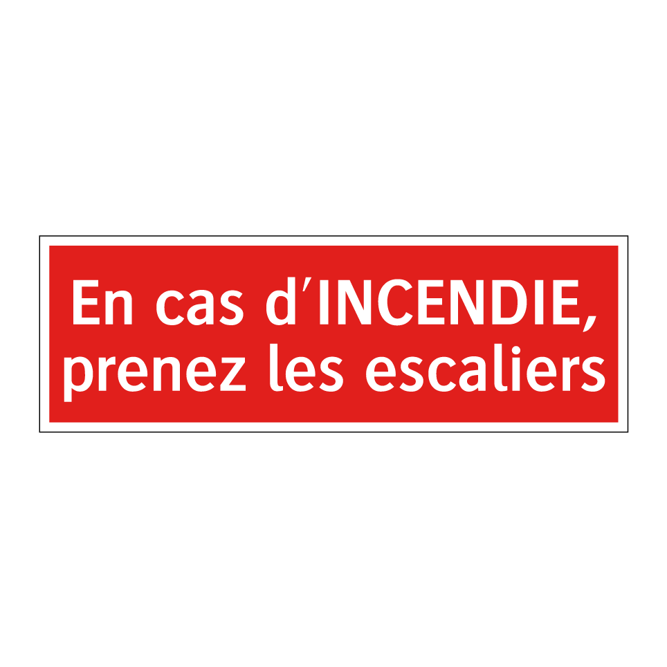 Panneau de signalisation incendie avec le texte En cas d'INCENDIE, prenez les escaliers