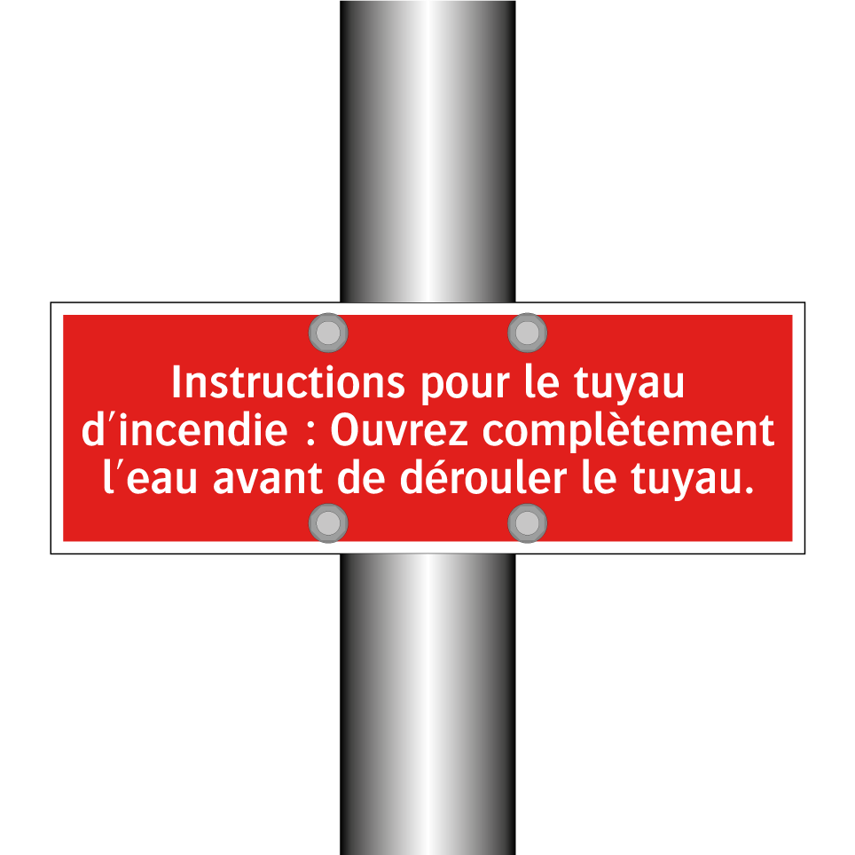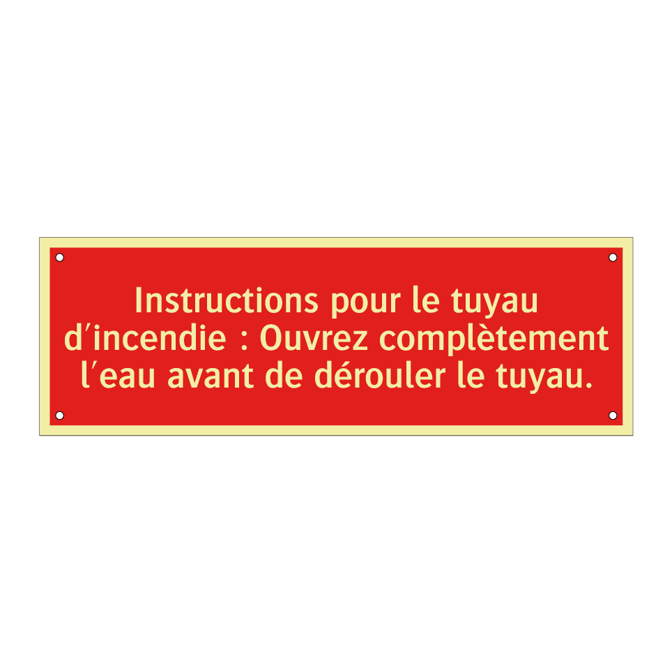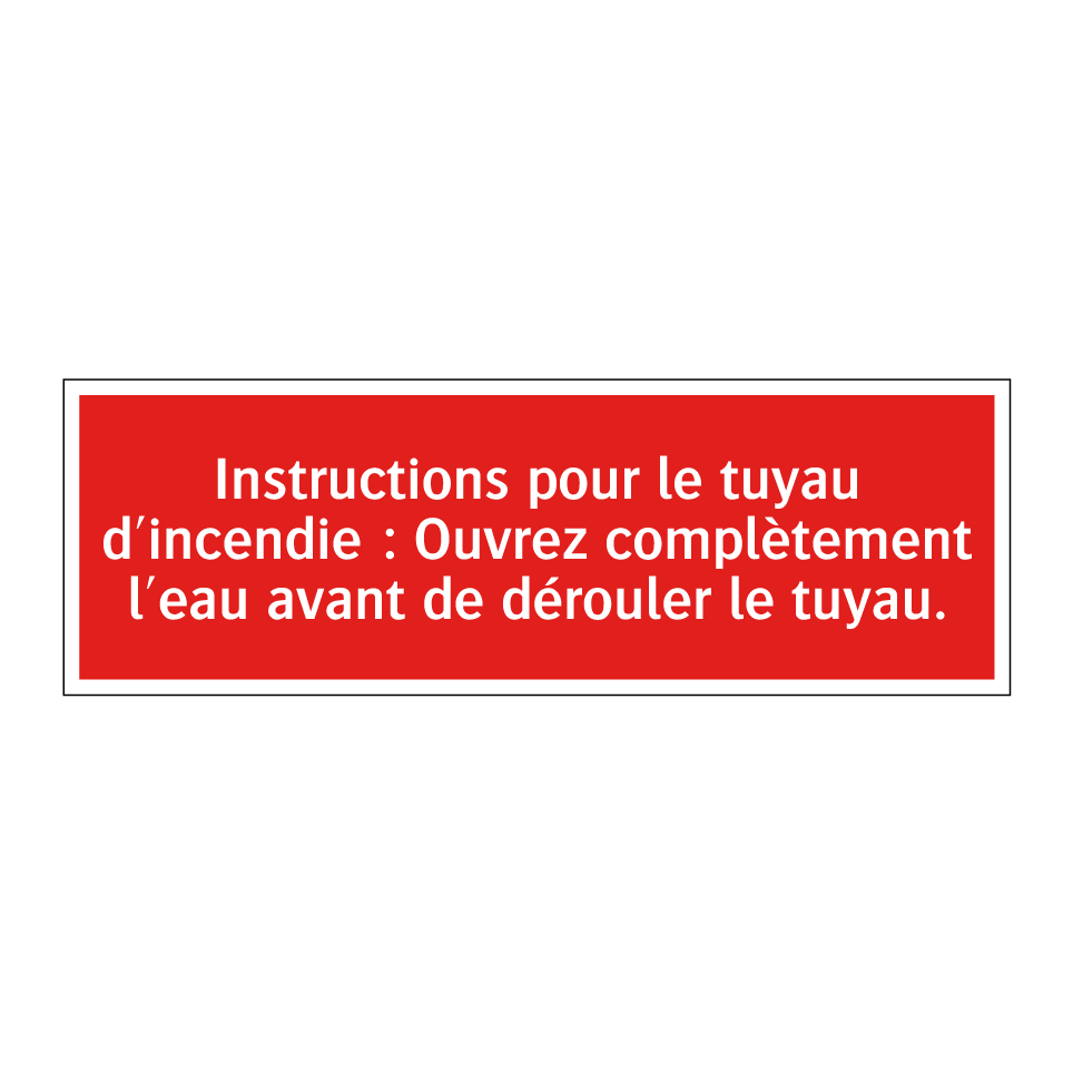 Panneau de signalisation incendie avec le texte Instructions pour le tuyau d'incendie : Ouvrez complètement l'eau avant de dérouler le tuyau.