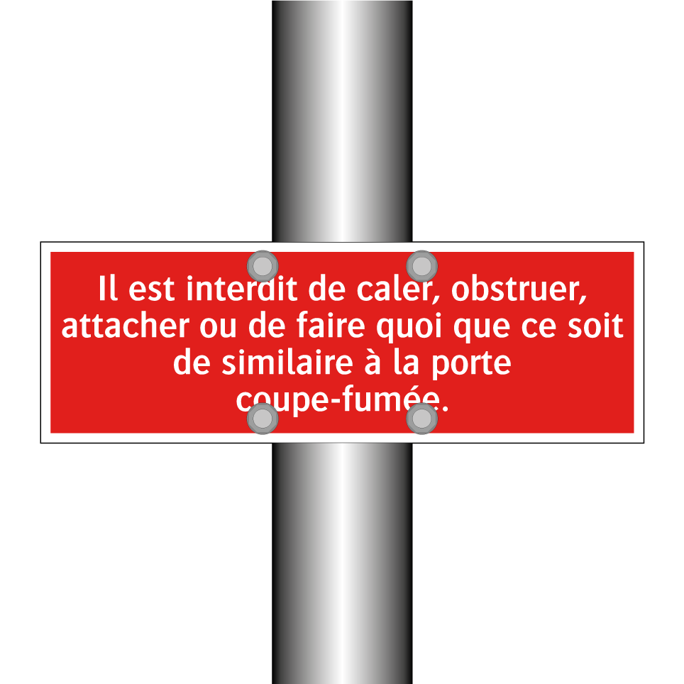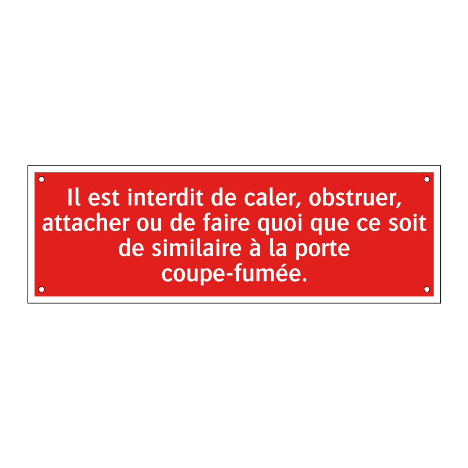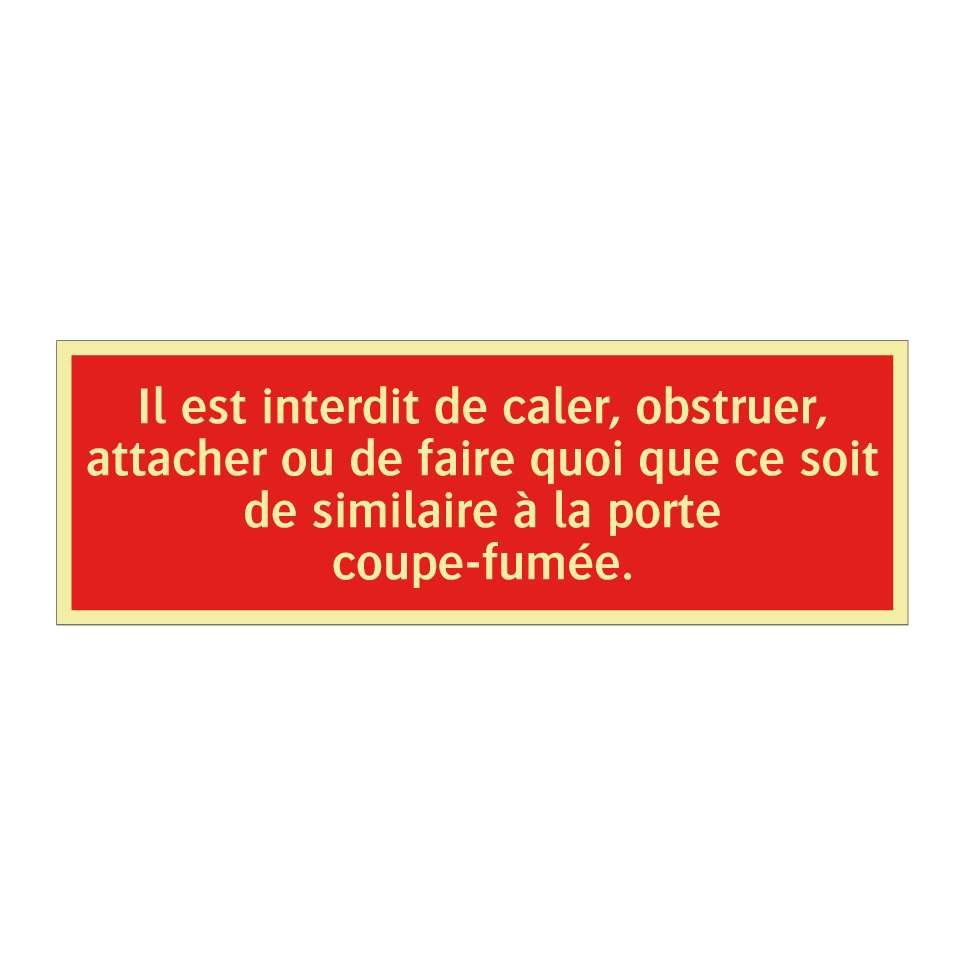 Panneau de signalisation incendie avec le texte Il est interdit de caler, obstruer, attacher ou de faire quoi que ce soit de similaire à la porte coupe-fumée.