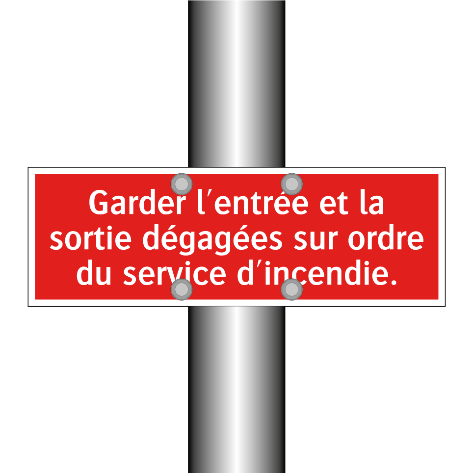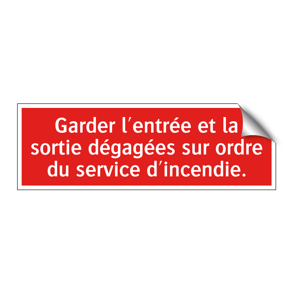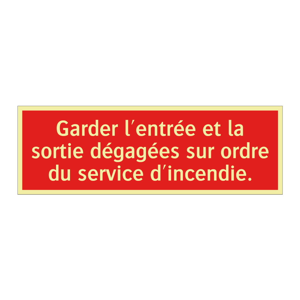 Panneau de signalisation incendie avec le texte Garder l'entrée et la sortie dégagées sur ordre du service d'incendie.