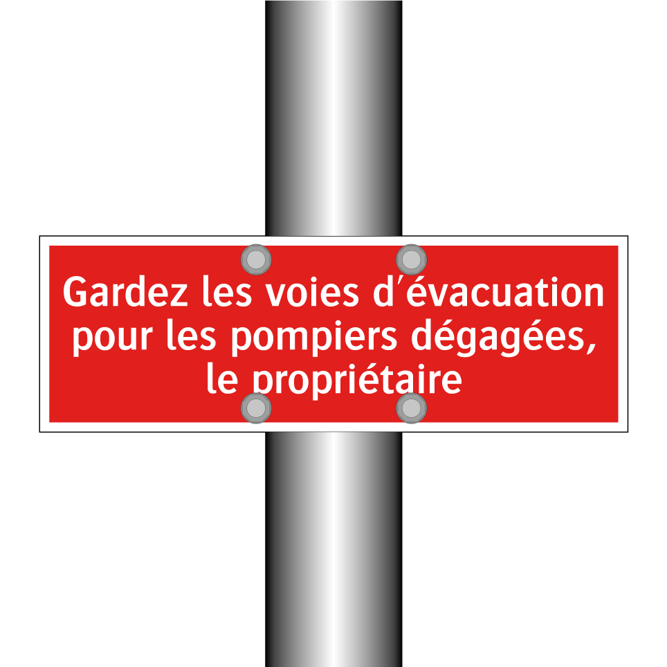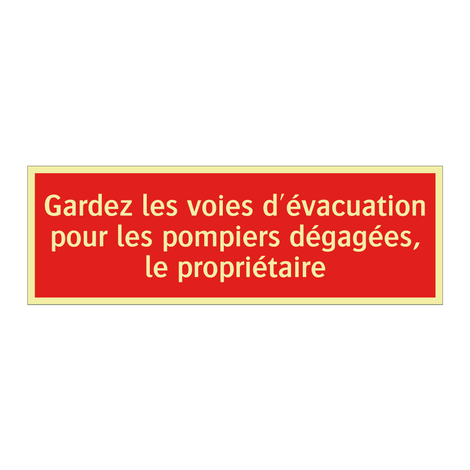 Panneau de signalisation incendie avec le texte Gardez les voies d'évacuation pour les pompiers dégagées, le propriétaire