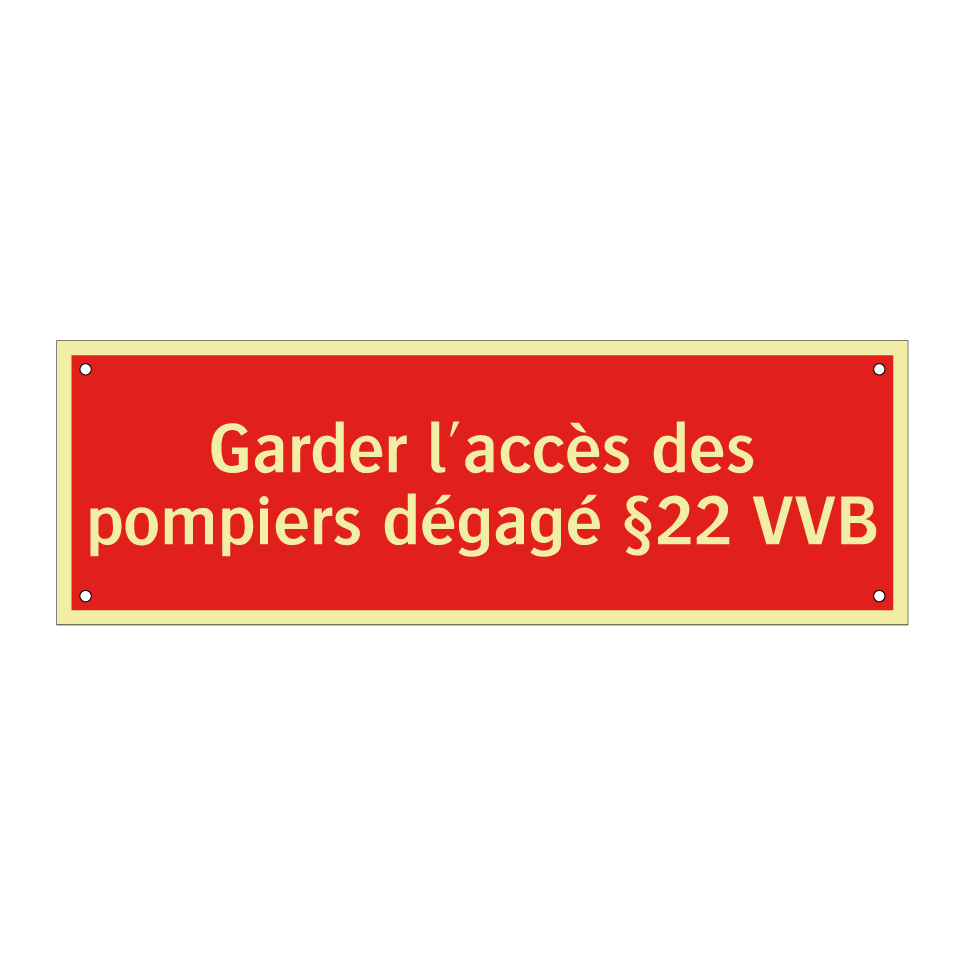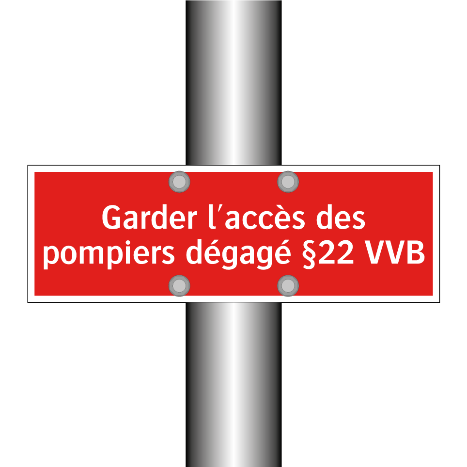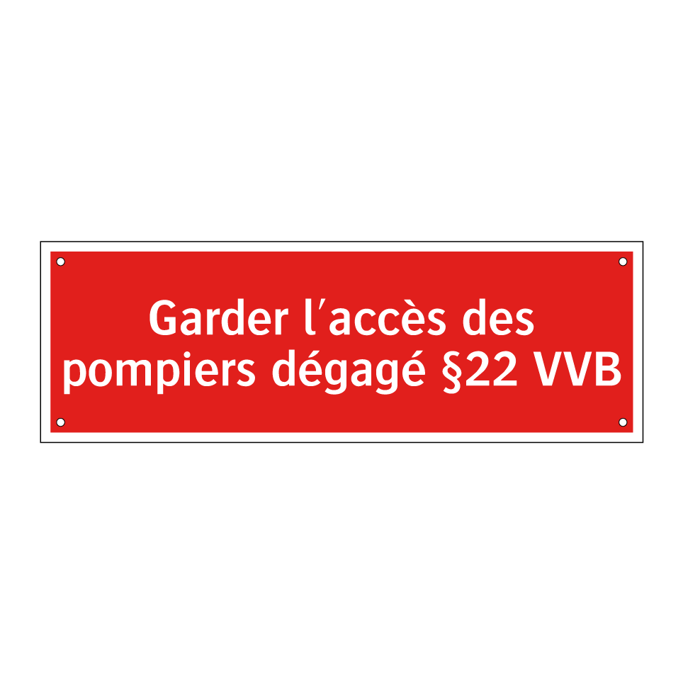 Panneau de signalisation incendie avec le texte Garder l'accès des pompiers dégagé §22 VVB