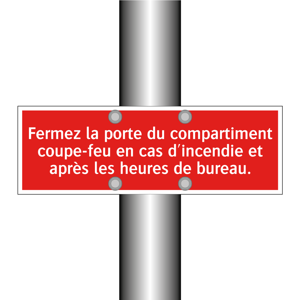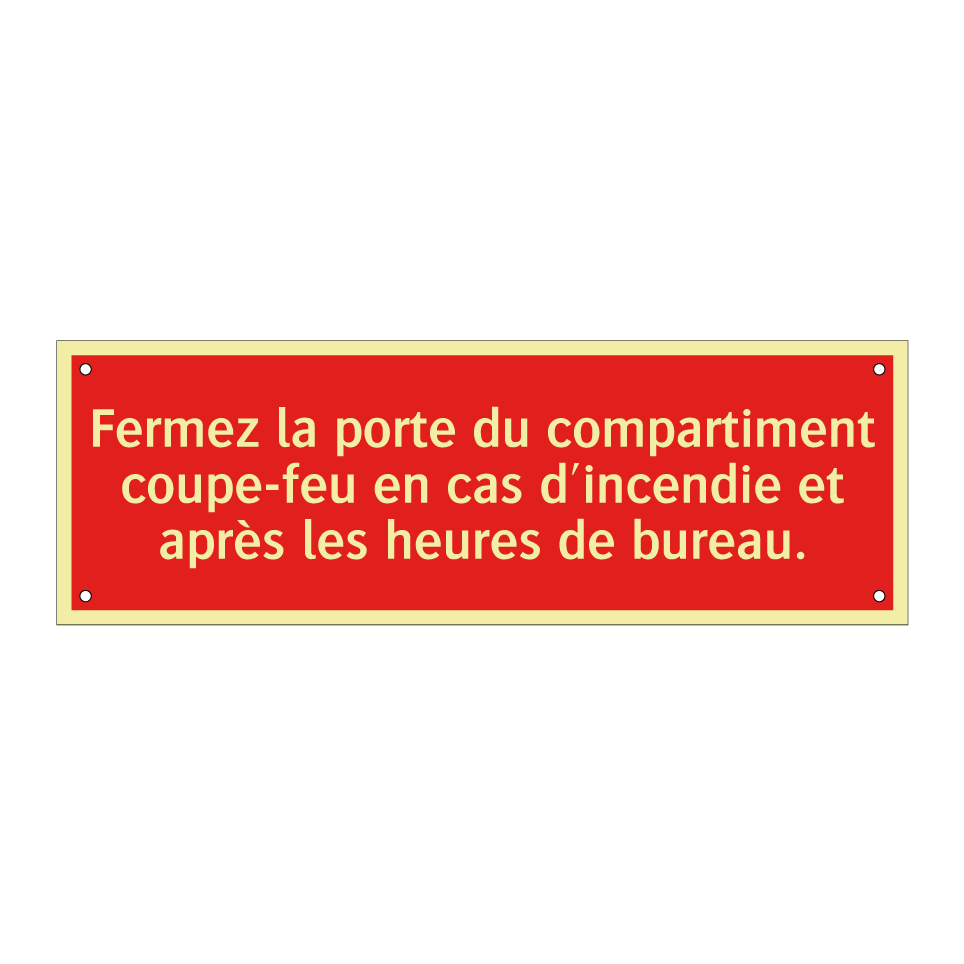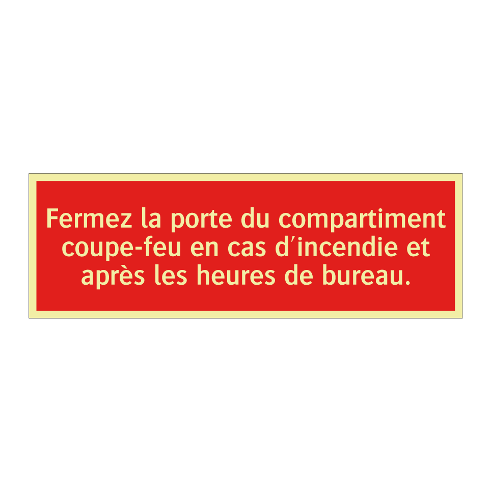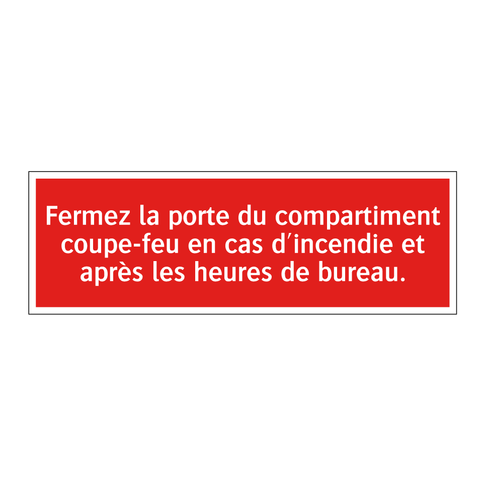 Panneau de signalisation incendie avec le texte Fermez la porte du compartiment coupe-feu en cas d'incendie et après les heures de bureau.