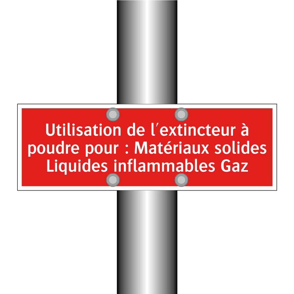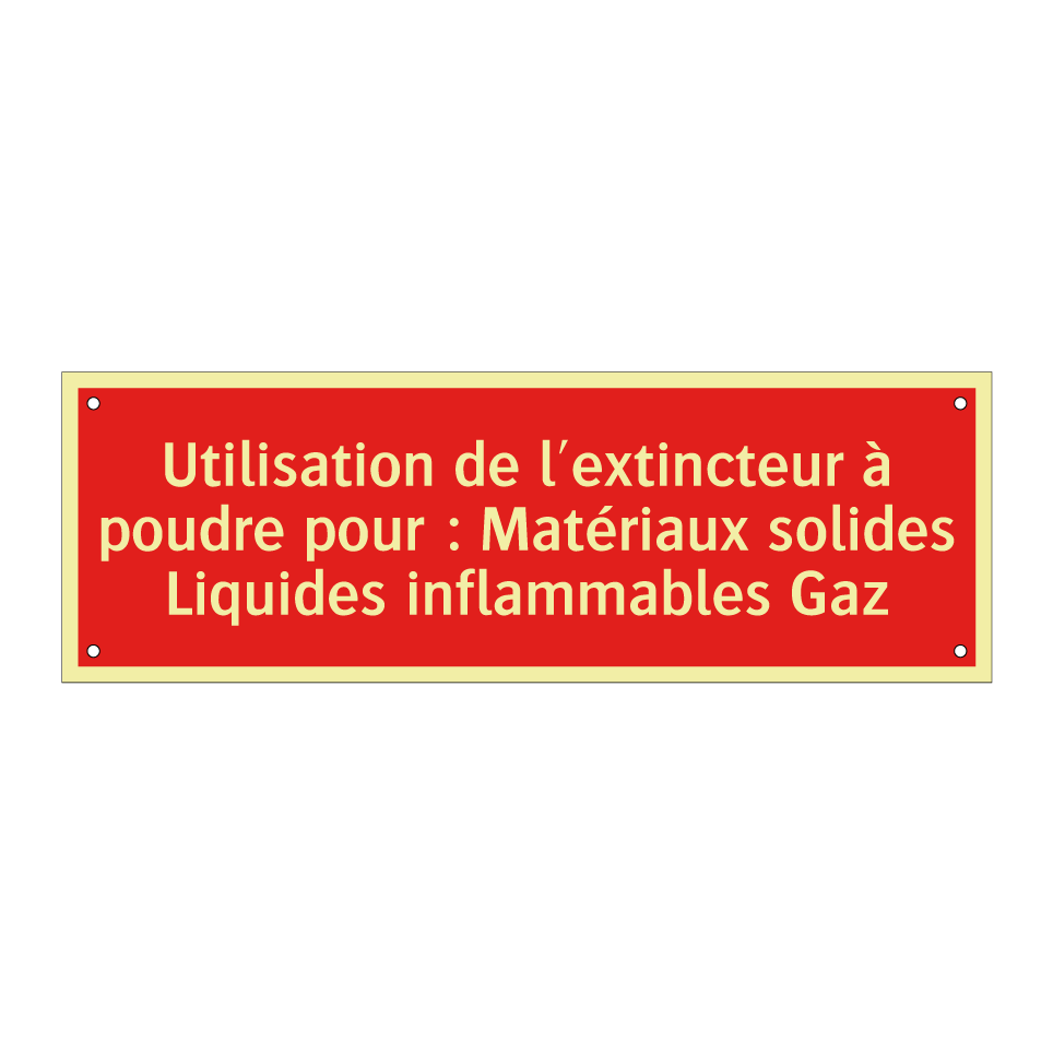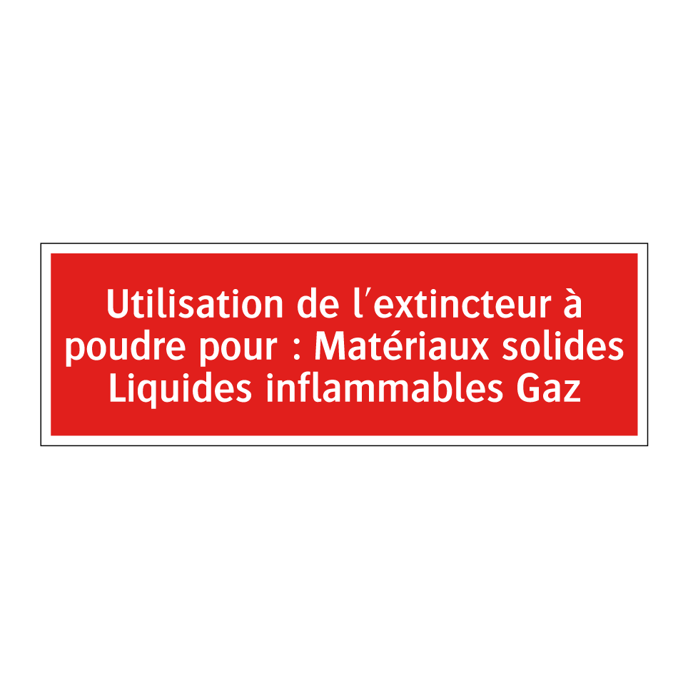 Panneau de signalisation incendie avec le texte Utilisation de l'extincteur à poudre pour : Matériaux solides Liquides inflammables Gaz