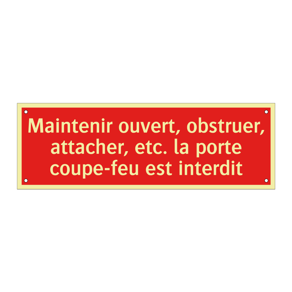 Panneau de signalisation incendie avec le texte Maintenir ouvert, obstruer, attacher, etc. la porte coupe-feu est interdit