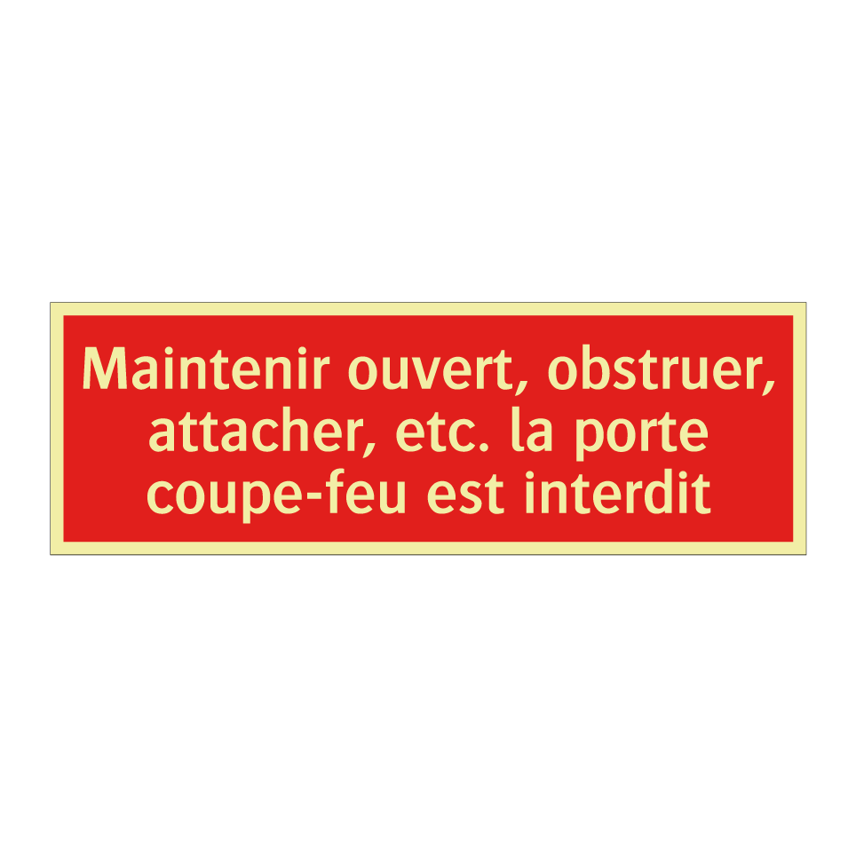 Cette signalisation de sécurité incendie, avec son fond rouge et son texte blanc, est essentielle pour garantir la sécurité dans les bâtiments. Elle est conçue pour être placée à proximité des portes coupe-feu, rappelant l'interdiction de les bloquer ou de les attacher. Idéale pour les environnements tels que les bureaux, les écoles, les hôpitaux et les espaces publics, elle assure que les voies d'évacuation restent dégagées en cas d'urgence. Sa visibilité et son message clair en font un outil indispensable pour la prévention des incendies.