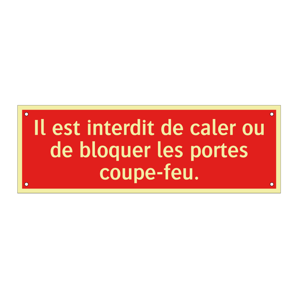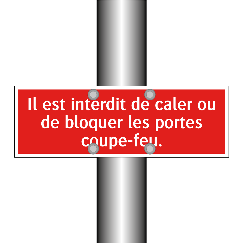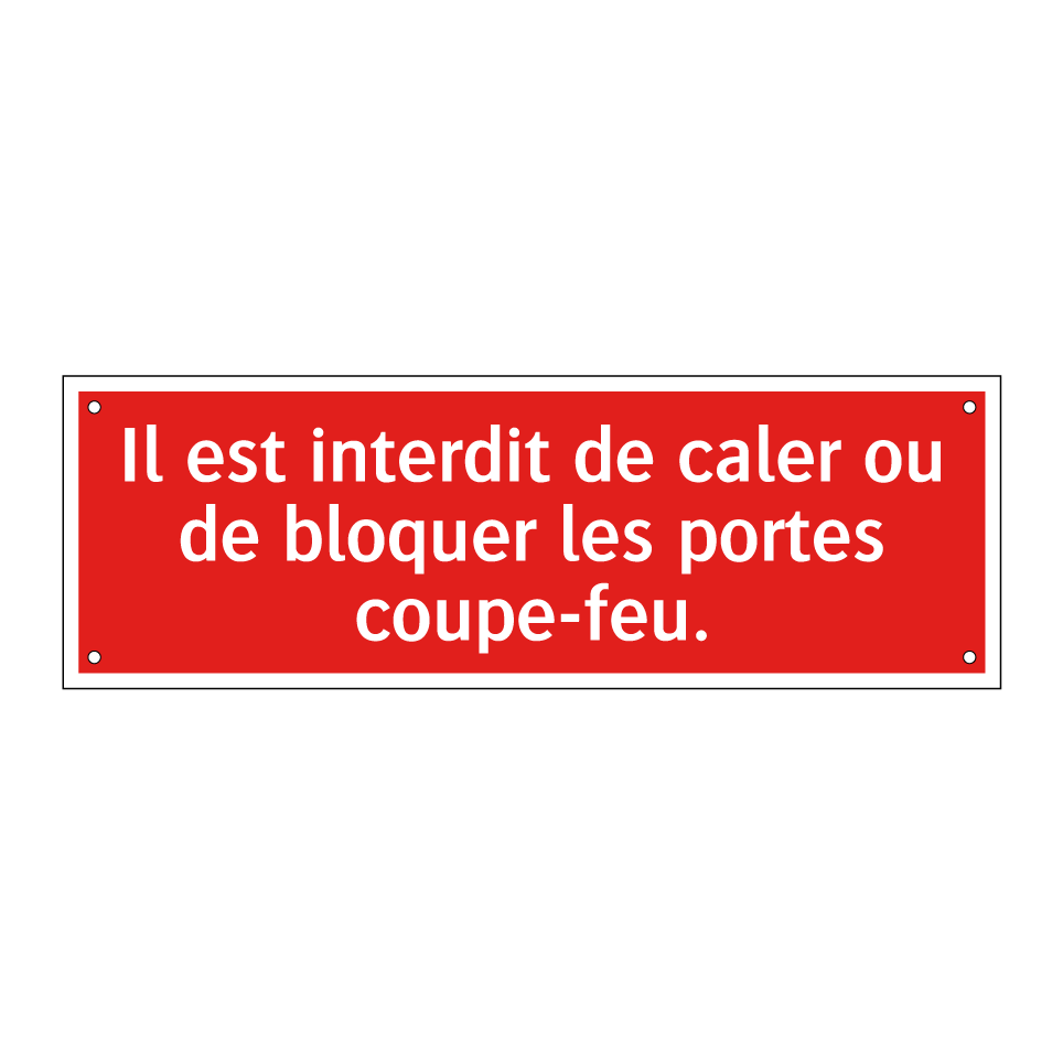 Panneau de signalisation incendie avec le texte Il est interdit de caler ou de bloquer les portes coupe-feu.