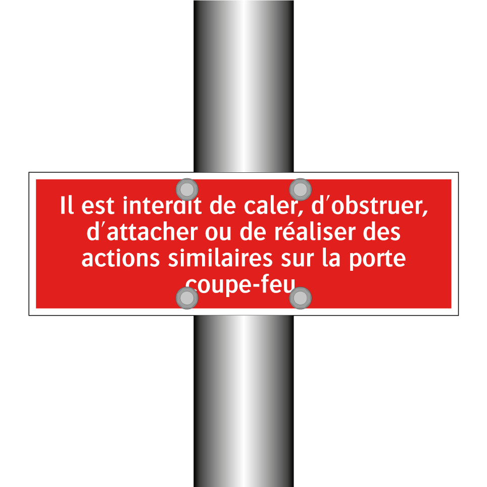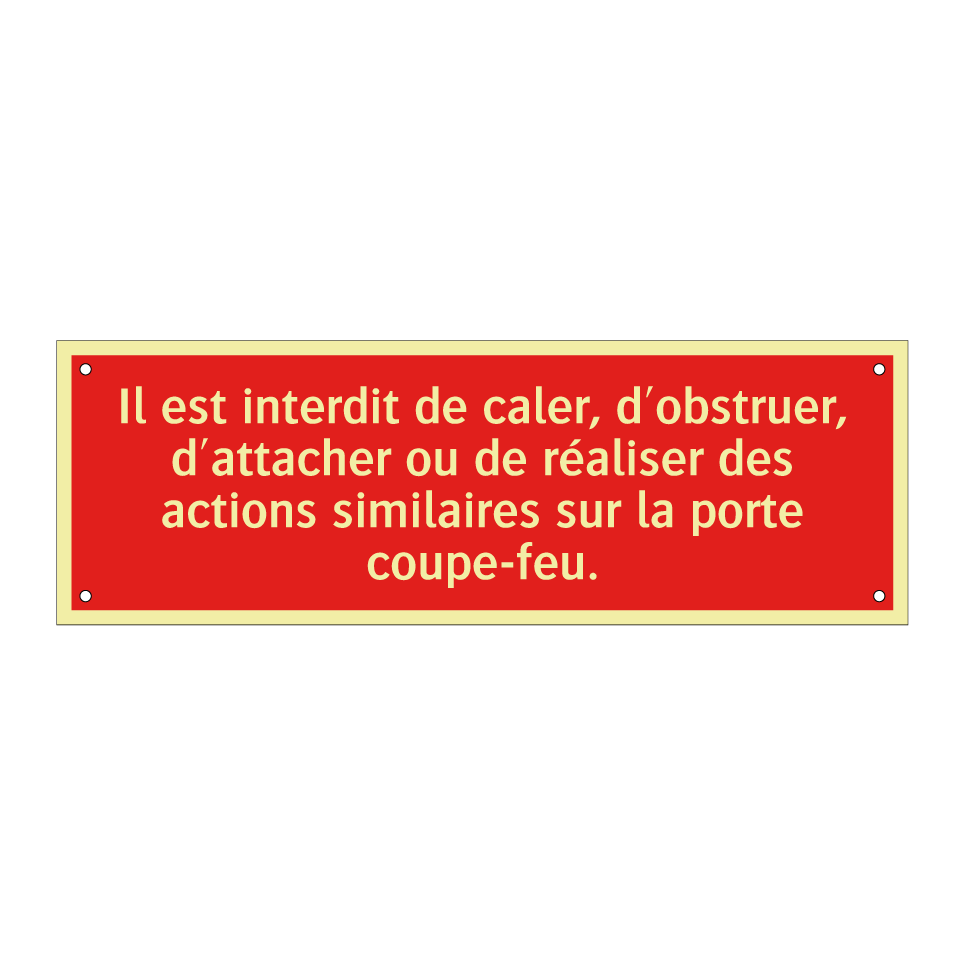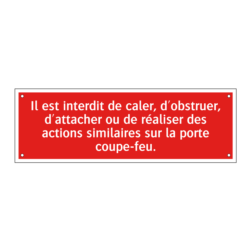 Panneau de signalisation incendie avec le texte Il est interdit de caler, d'obstruer, d'attacher ou de réaliser des actions similaires sur la porte coupe-feu.