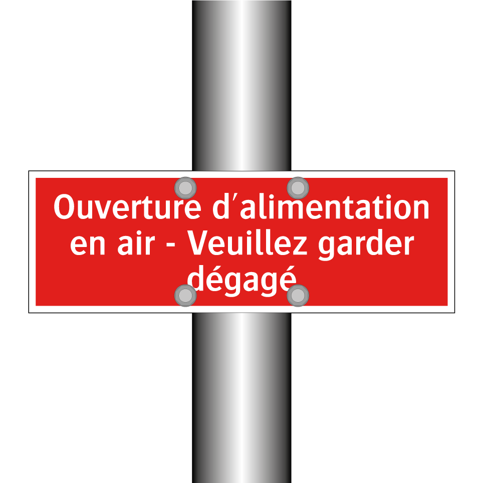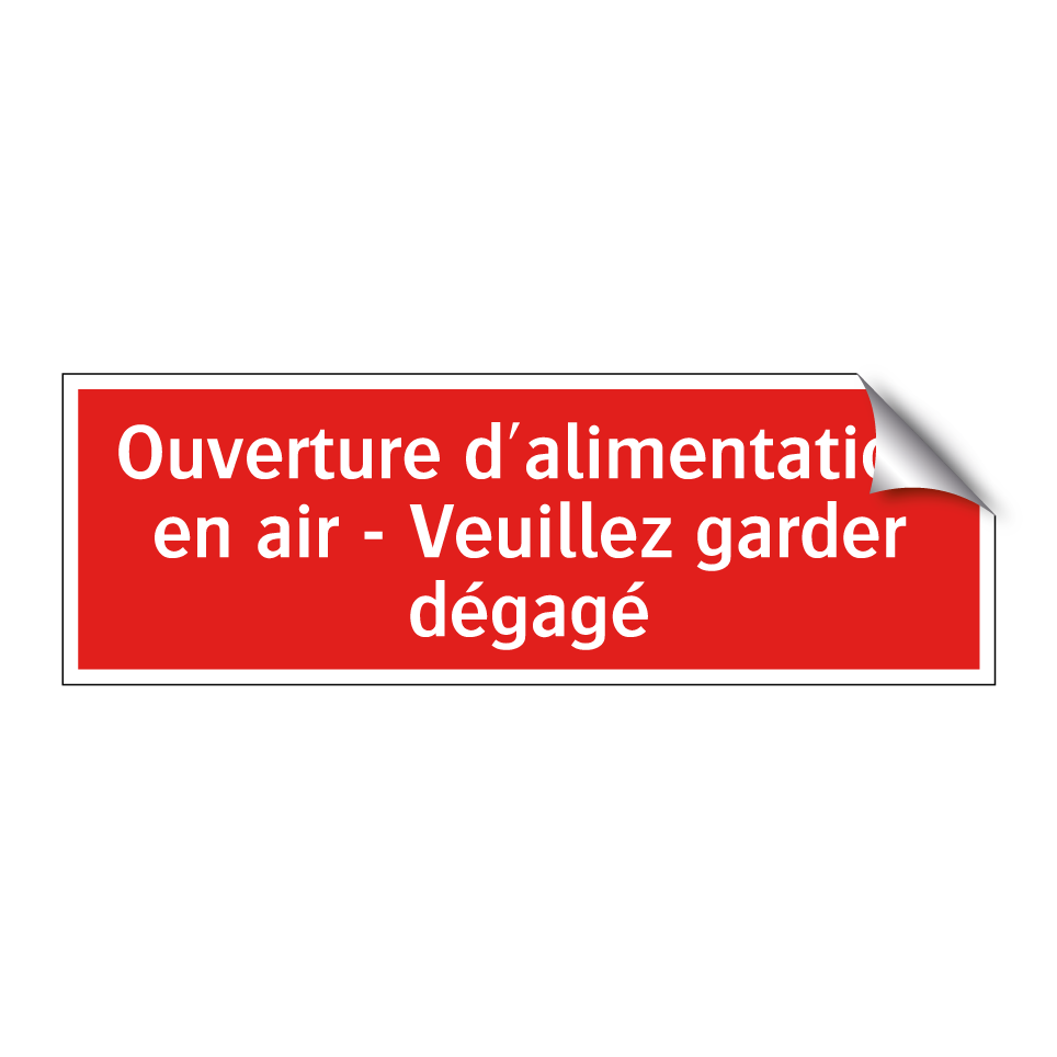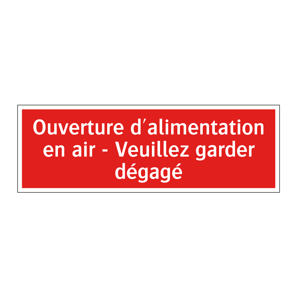 Panneau de signalisation incendie avec le texte Ouverture d'alimentation en air - Veuillez garder dégagé