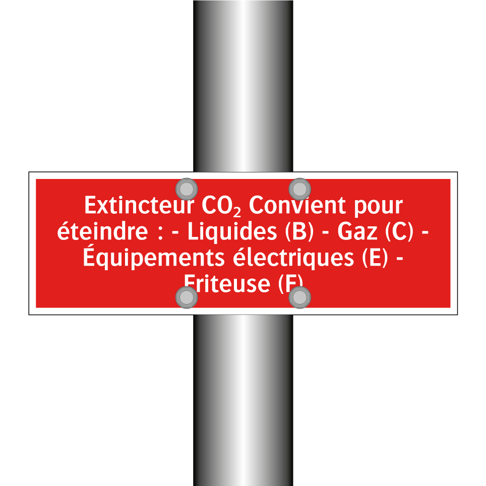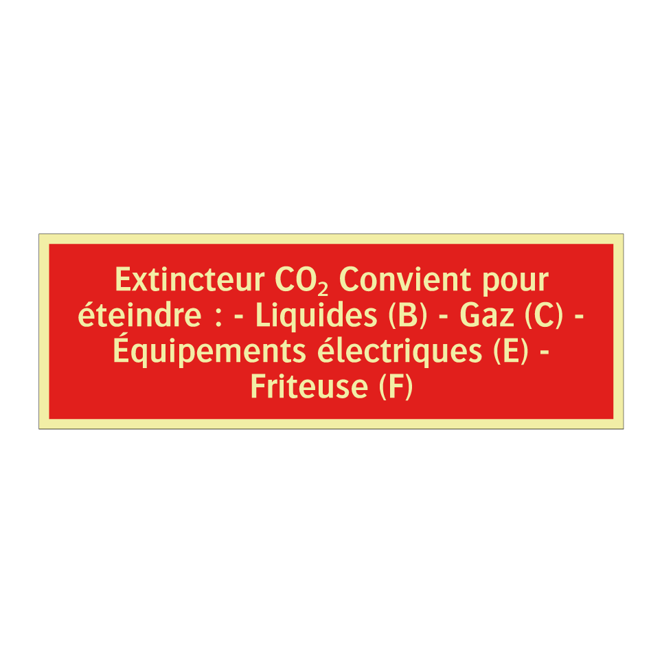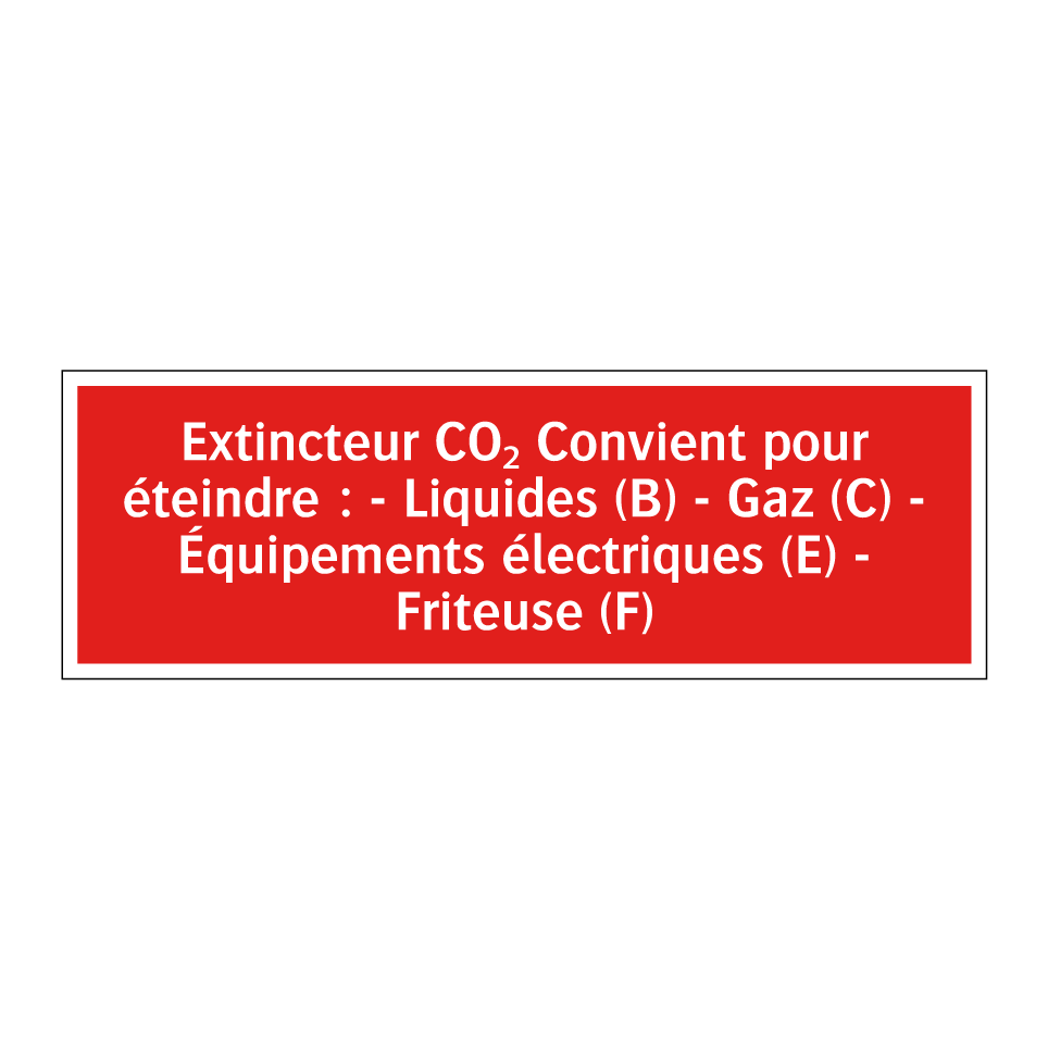 Panneau de signalisation incendie avec le texte Extincteur CO₂ Convient pour éteindre : - Liquides (B) - Gaz (C) - Équipements électriques (E) - Friteuse (F)