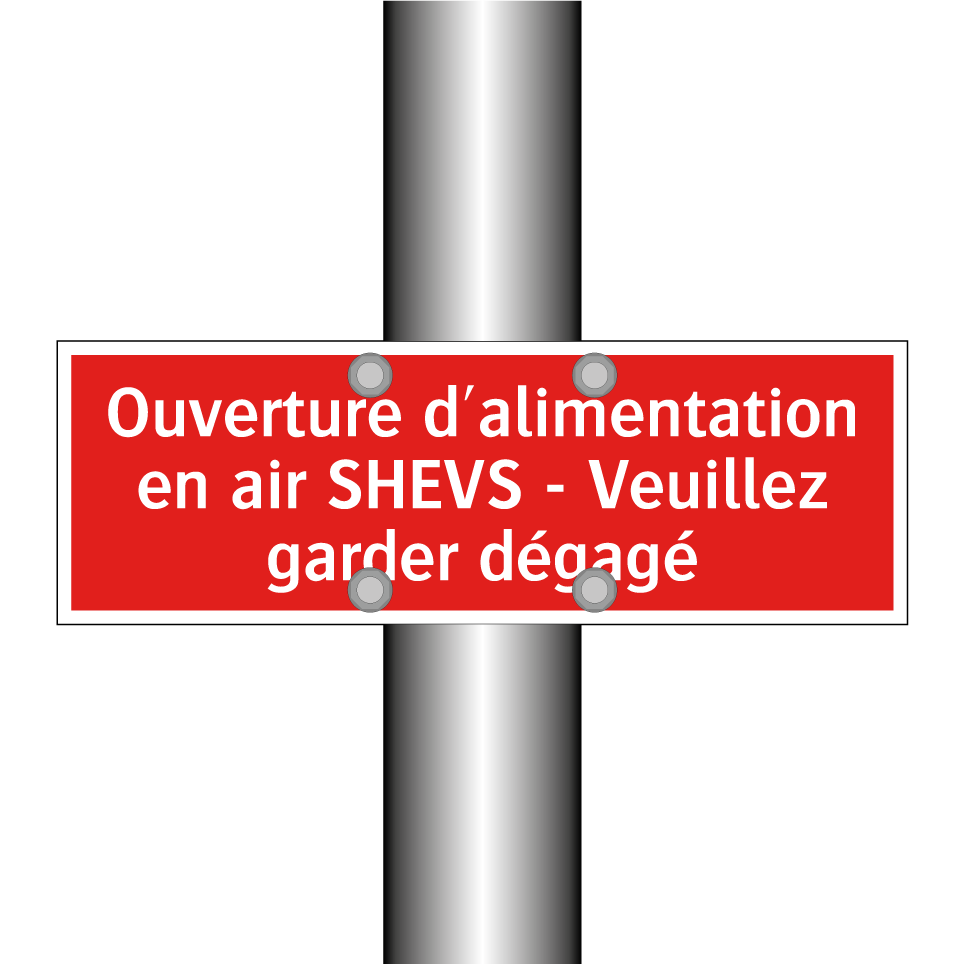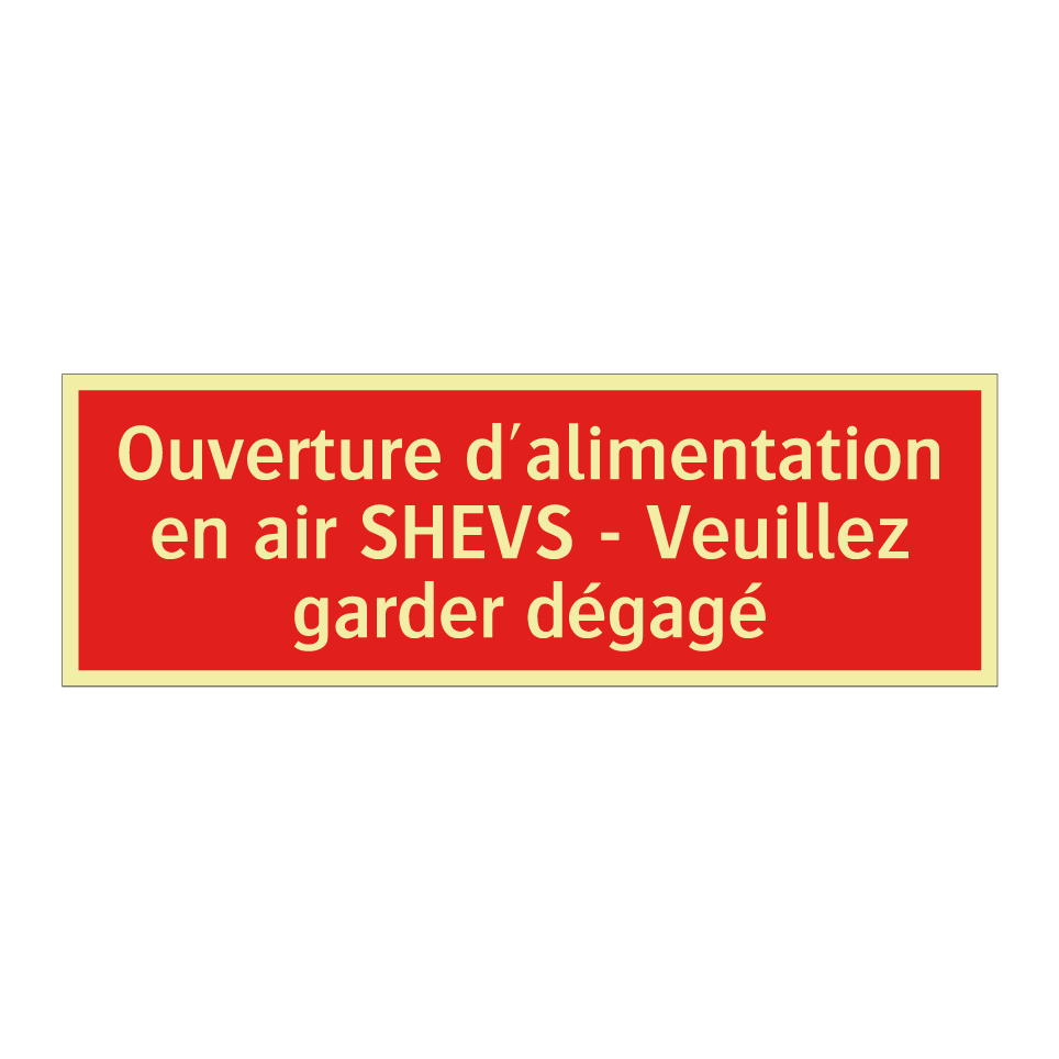 Panneau de signalisation incendie avec le texte Ouverture d'alimentation en air SHEVS - Veuillez garder dégagé