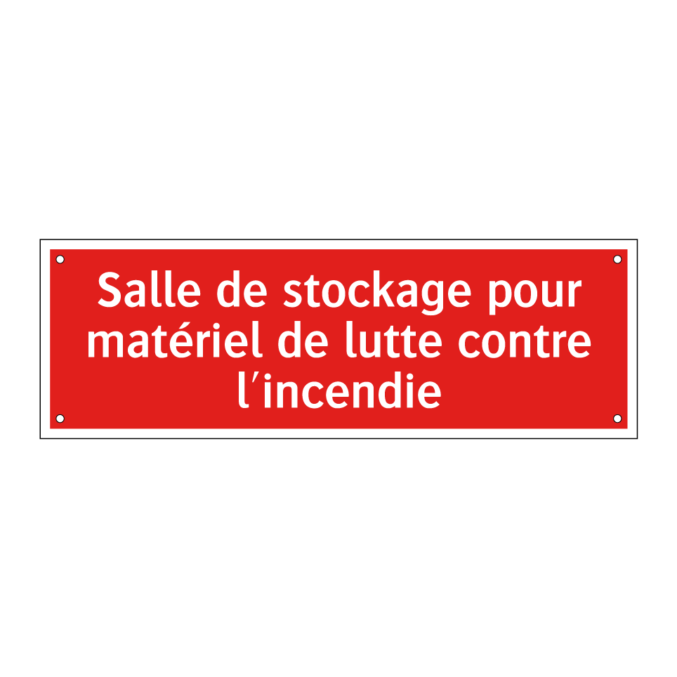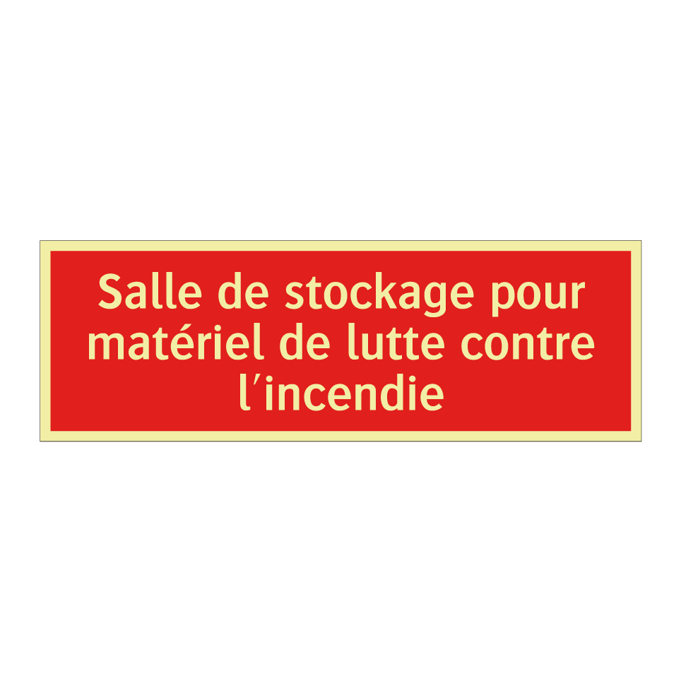 Panneau de signalisation incendie avec le texte Salle de stockage pour matériel de lutte contre l'incendie