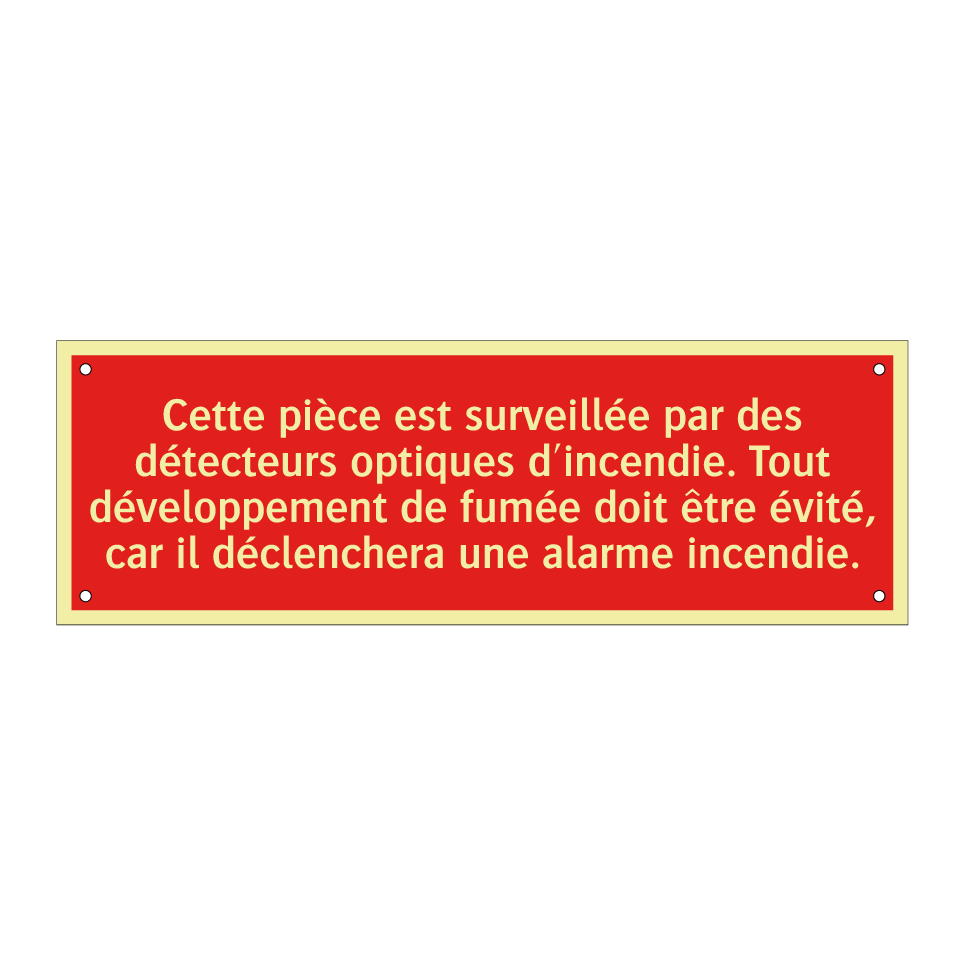 Panneau de signalisation incendie avec le texte Cette pièce est surveillée par des détecteurs optiques d'incendie. Tout développement de fumée doit être évité, car il déclenchera une alarme incendie.
